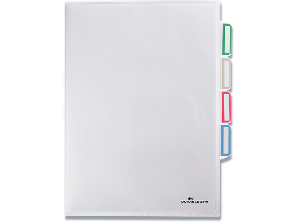 3-delt transparent plastomslag til dokumenter i A4-format. Selvklæbende forskellige farvede etiketter til mærkning af faner inkluderet.