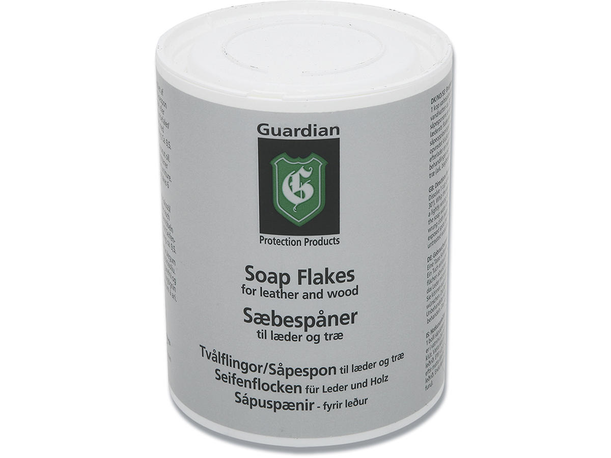 Guardian Sæbespåner er kogt på palmekerneolie og kokosolie og indeholder hverken parfume, farve, optisk hvidt eller blegemiddel, og er ”den gammeldags måde” at pleje både læder og træ på. Guardian Sæbespåner er testet af Teknologisk Institut og tildelt ”Indeklimamærket”.