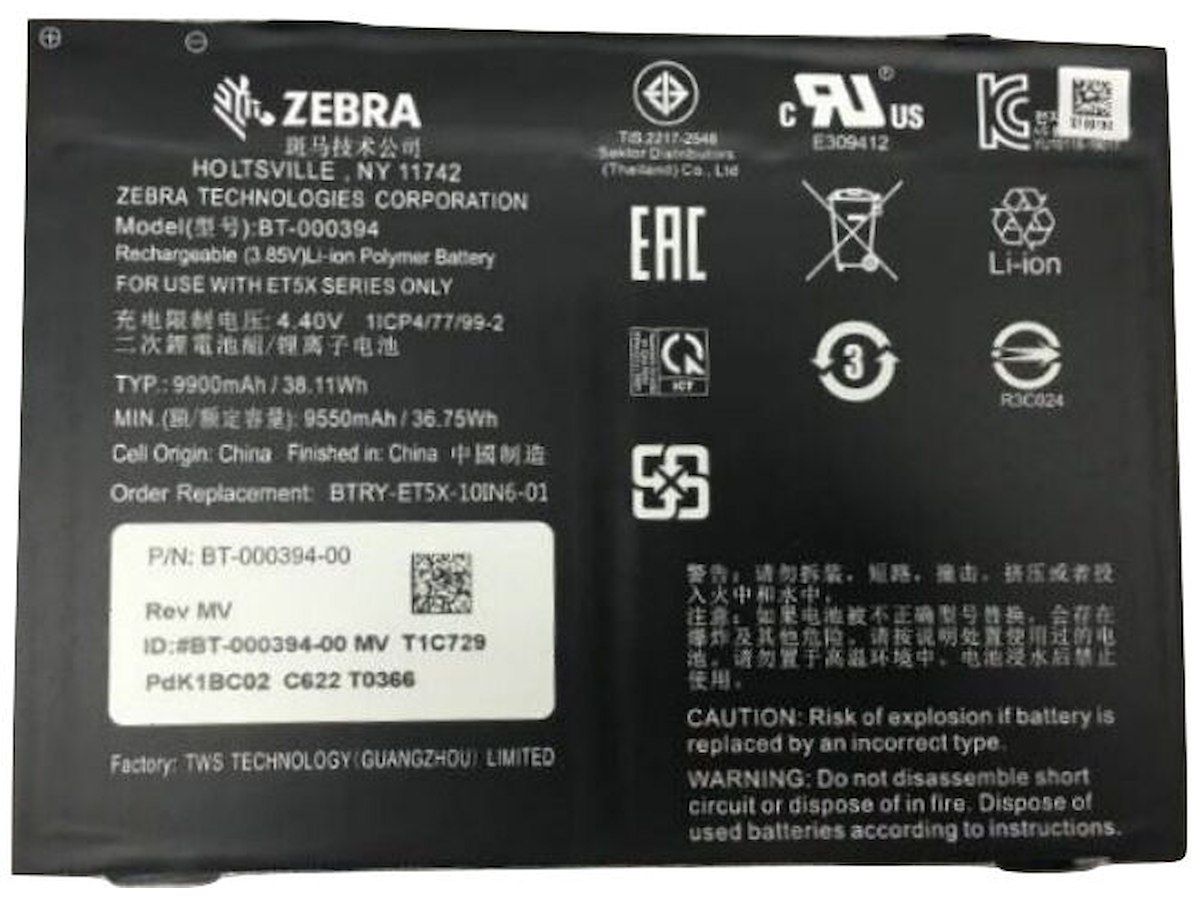Zebra BTRY-ET5X-10IN5-01. Type: Batteri, Mærke kompatibilitet: Zebra, Kapabilitet: ET51, ET56