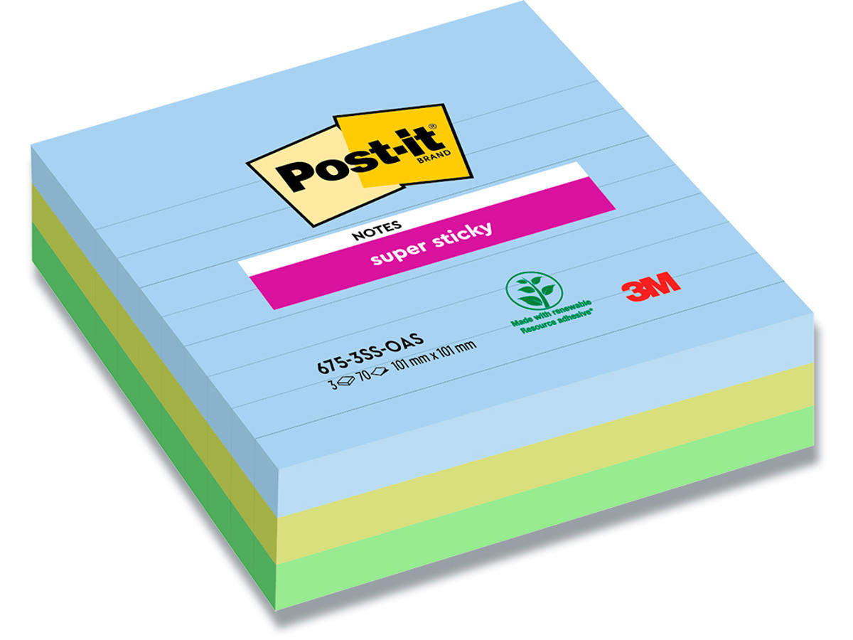 Memonotes, 101x101 mm, Assorteret Oasis, 3 blokke, Post-it Super Sticky Linjeret