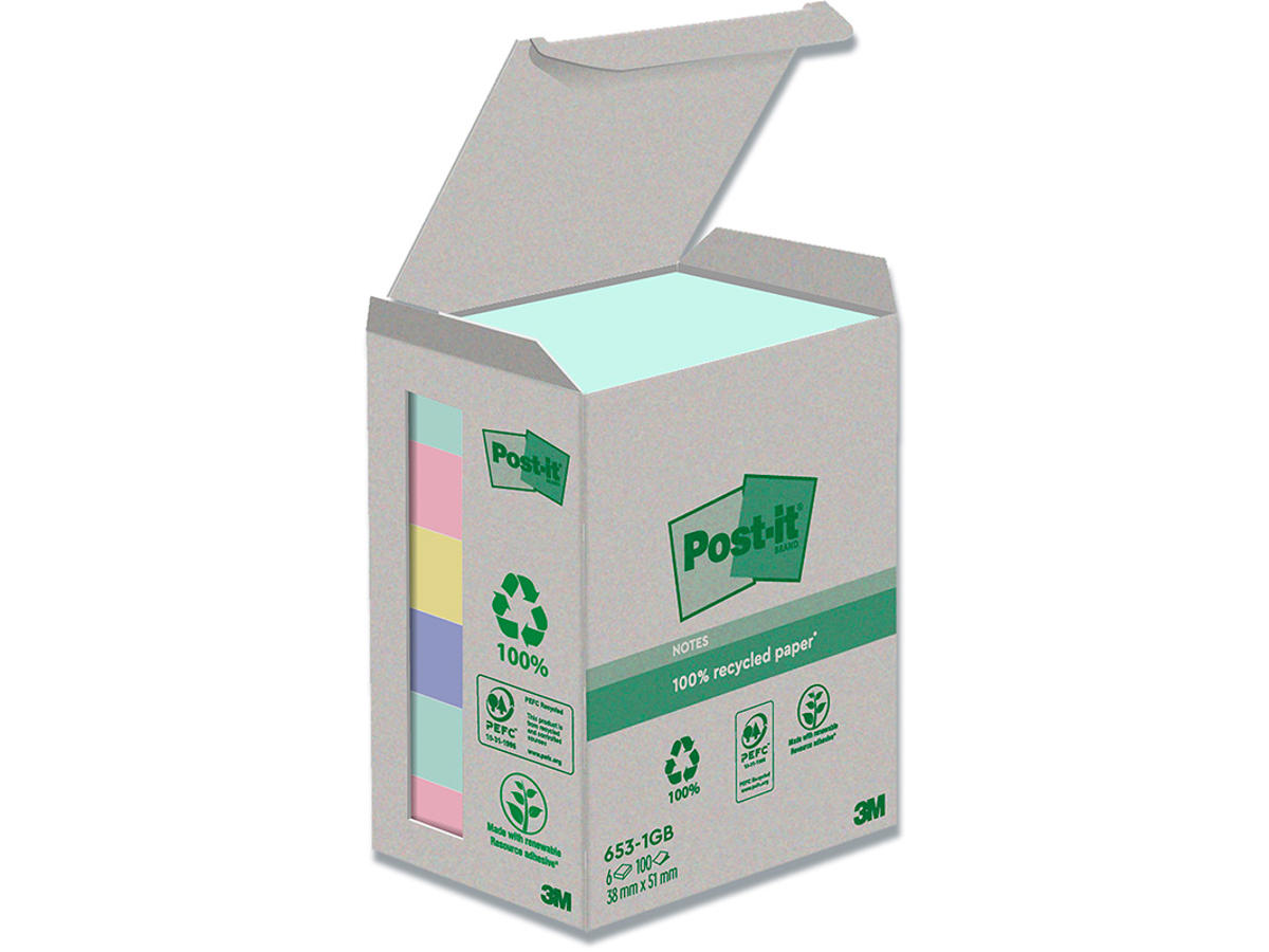 Memonotes, 38x51 mm, Assorteret Pastel rainbow, 6 blokke, Post-it Recycled