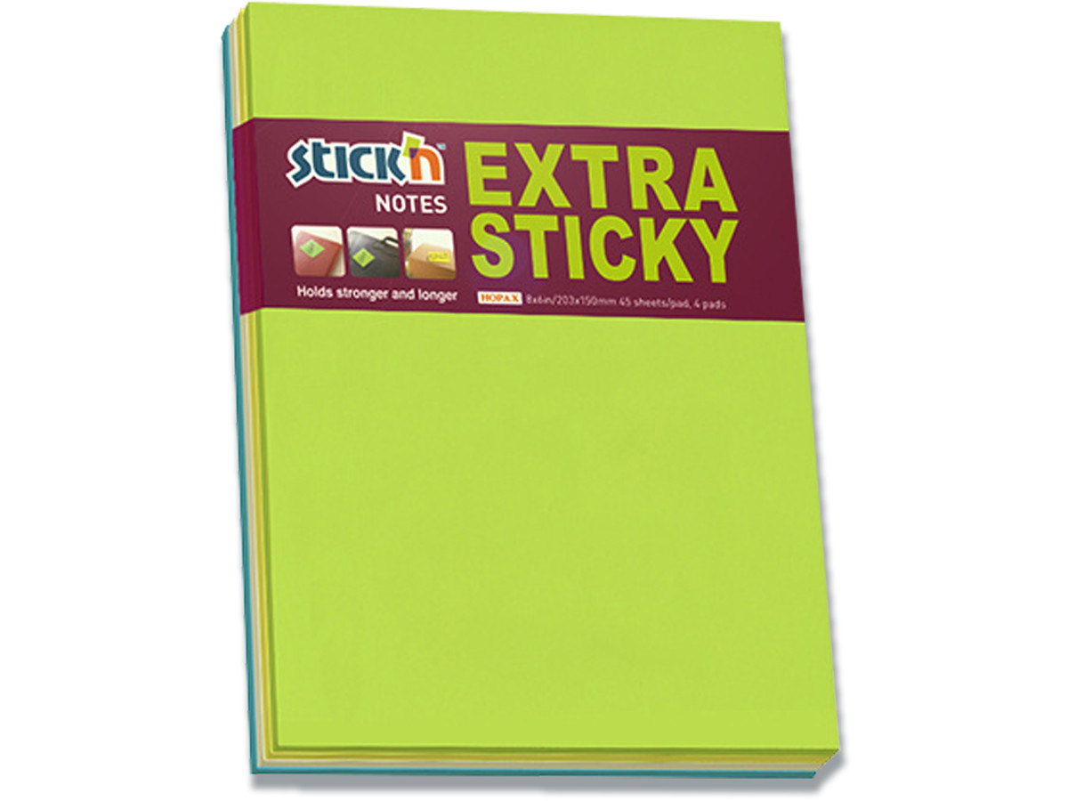 Memonotes, 203x150 mm, 4 assorterede farver, 4 blokke, Stick'n Extra Sticky