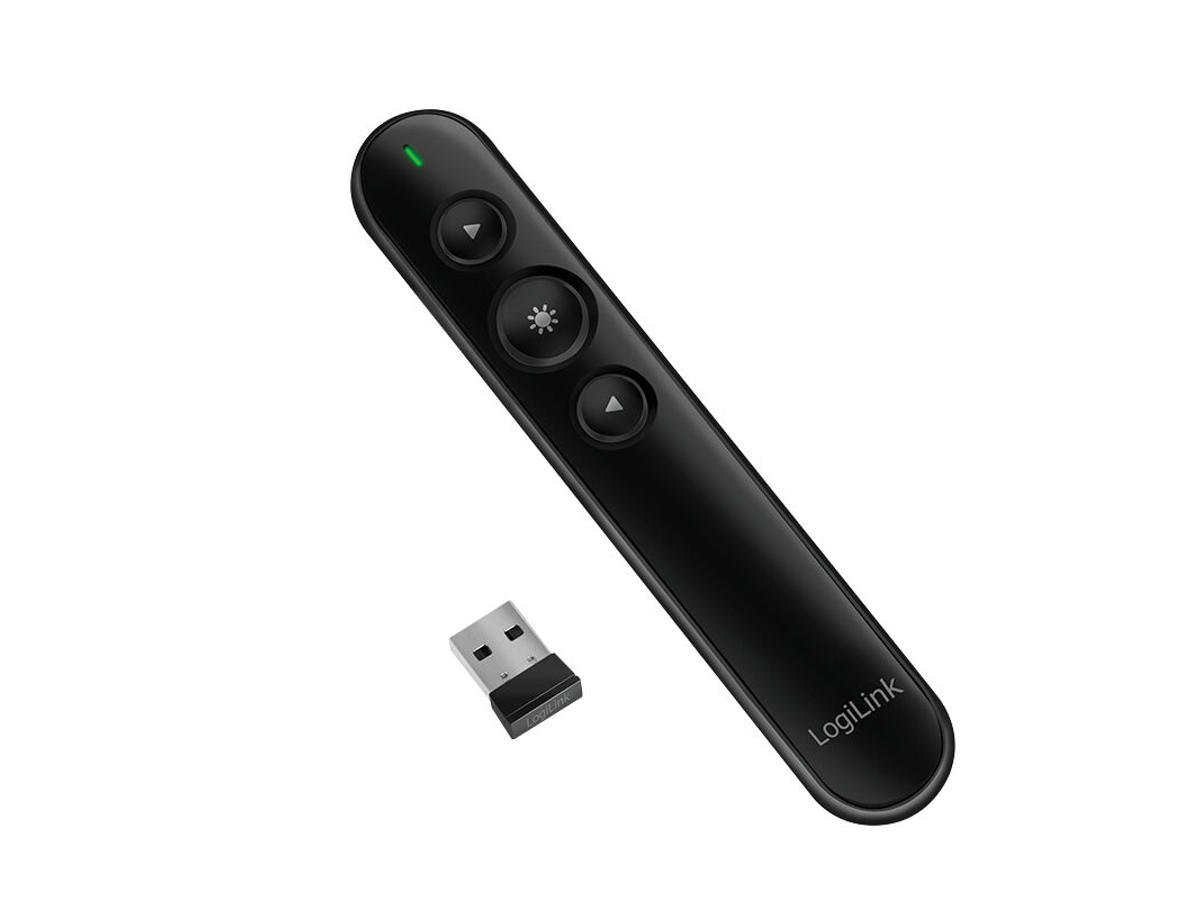 LogiLink ID0190. Trådløs teknologi: RF, Modtagertype: Nano-modtager, Frekvensbånd: 2.4 GHz. Produktfarve: Sort, Præsentationsfunktioner: Laserpointer, Laserpen farve: Rød. Batteritype: AAA. Bredde: 26 mm, Dybde: 145 mm, Højde: 15 mm