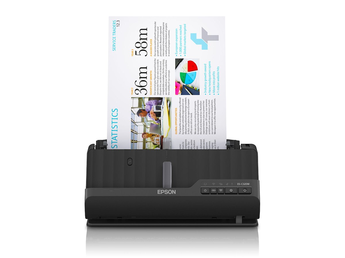 Epson ES-C320W. Maksimal scanningsstørrelse: 215,9 x 3048 mm, Optisk scanningsopløsning: 600 x 600 dpi, Input farvedybde: 30 Bit. Scanner type: ADF + Ark-fodret scanner, Produktfarve: Sort, Kontroltype: Knapper. Daglig driftscyklus (maks.): 3500 Sider, Lyskilde: ReadyScan LED, Scan til: E-mail, FTP, Network folder, Udskriv. Standard indgangskapacitet: 20 ark. Maksimal ISO A-serie papirstørrelse: A4, Scanning af understøttede medietyper: Visitkort, Plastkort, Post Card(JPN), ISO A-serie, størrelser (A0...A9): A4, A5, A6