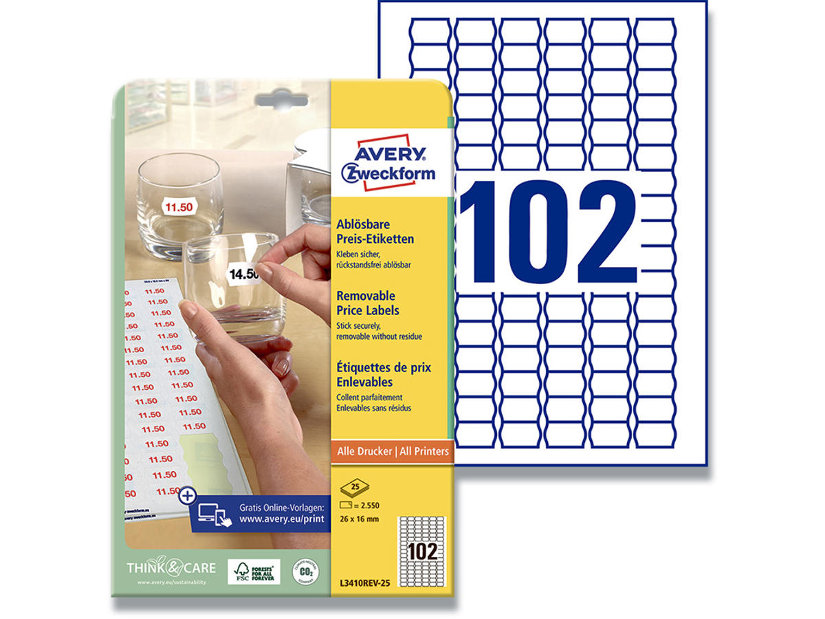 Vil du selv printe dine prismærker på din egen A4 printer? Intet problem, det kan du klare nemt og enkelt med Avery's aftagelige prisetiketter L3410REV-25 med 102 etiketter/ark og 2550 etiketter/pk. Printede prisetiketter giver et professionelt indtryk frem for de håndskrevne prisetiketter, som kan være svære at læse, og der er oven i købet plads til at printe dit logo eller en specifik tekst på prismærket. Design og print prisetiketter på din egen printer i præcis det antal, som du har brug for. Det er både nemt, fleksibelt og økonomisk. Prisetiketterne er aftagelige, men klæber sikker og kan fjernes uden at de efterlade limrester. Etiketterne er miljøvenligt fremstillet. De er kompatible med s/h- og farvelaserprintere, samt inkjetprintere. Du kan nemt og helt gratis designe og printe dine Avery produkter med vores software Avery Design & Print, hvor du finder skabeloner, grafik og designs - Klik her