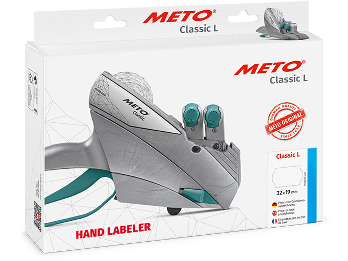 Den 2-linjes håndholdte prispistol Classic L, 30007649, fra METO er en klassisk prispistol, som har lang levetid og høj driftssikkerhed. Den skriver max 12+7 tegn, på 32 x 19 mm etiketter. Det ergonomiske greb sikrer en hurtig betjening, minimal belastning og at etiketterne kan dispenseres i høj hastighed. Det korte håndtag kræver minimal kraftanvendelse og sikrer en præcis og ensartet trykkvalitet. Printdelen med de teknisk avancerede enkelte bånd sikrer en præcis printkvalitet. Med Easy-handle systemet er prismærkepistolen enkel at betjene. Systemet sikrer udskiftning af farverulle, enkelt og uden tilsmudsning. Etiketrullerne udskiftes også hurtigt og enkelt. Pakken indeholder 1 håndholdt prispistol, som er klar til brug med etiketter, der er hvide og permanent klæbende, sort blækrulle samt brugsanvisning. Supplerende etiketter og blækruller kan tilkøbes.