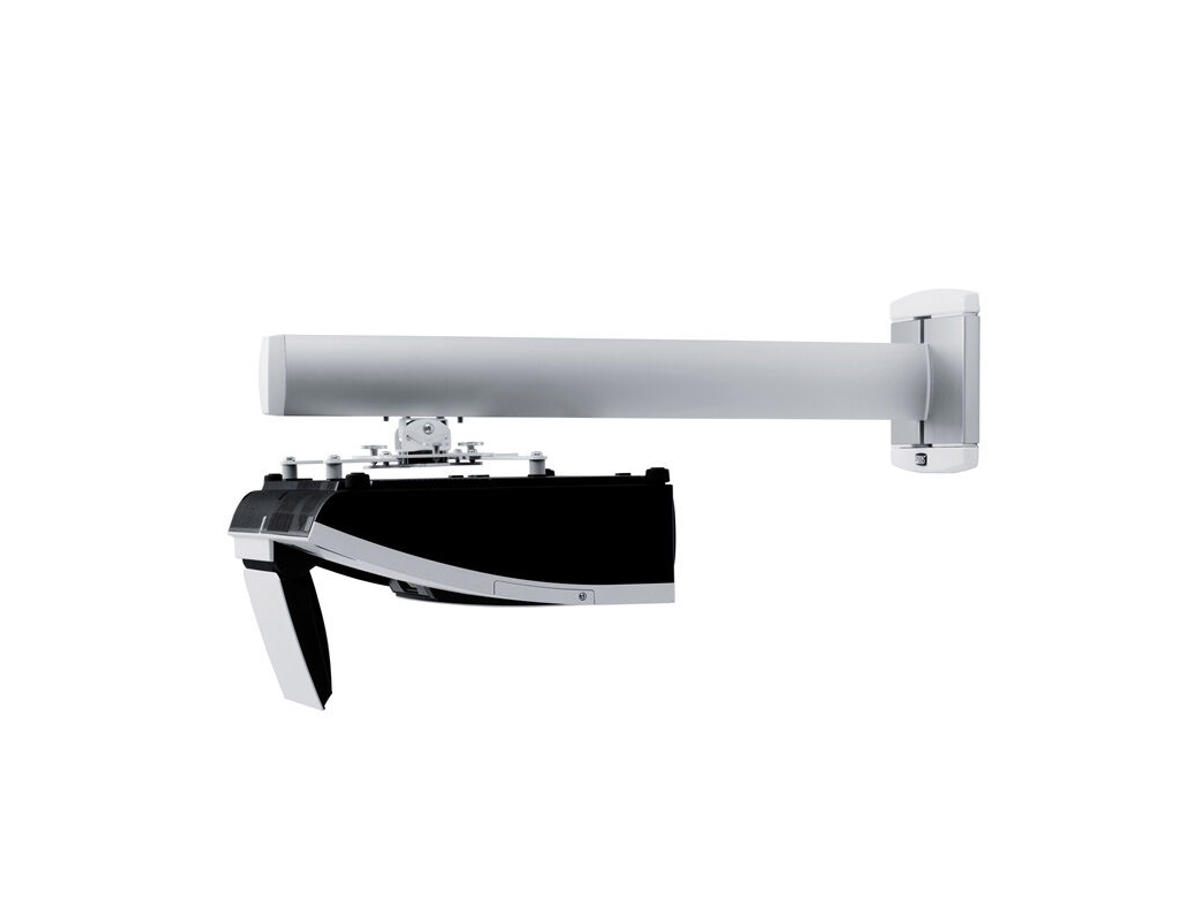 A wall bracket with generous adjustment facilities to obtain the best possible image quality at all positions. The projector can be suspendedat any location along the complete pillar for depth adjustment. Furthermore, the wall plate can be adjusted both horizontally andvertically. Fine adjustment is very easy with the aid of adjustment knobs on the universal slide, which is now available in white or black to match the projector. The choice of white or black plastic fittingsis also new.