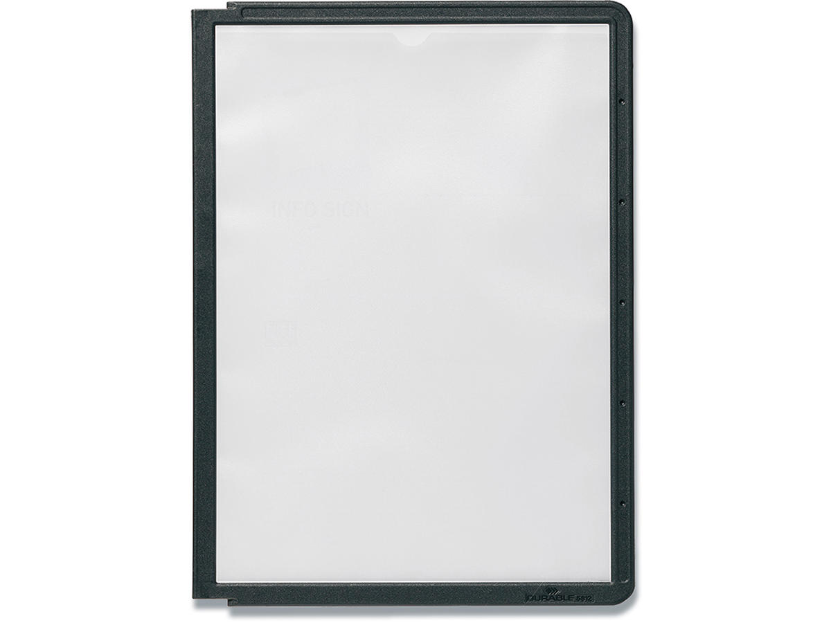 Lomme i format A5 af pp med sort ramme med topåbning. Passer DURABLES register-/display-/oversigt-systemer art nr 550601 og 550701. Lomme kan udstyres med etiketholder, at fastgøre langs den øvre kant eller side og er let justerbare (Durable art nr 560919).