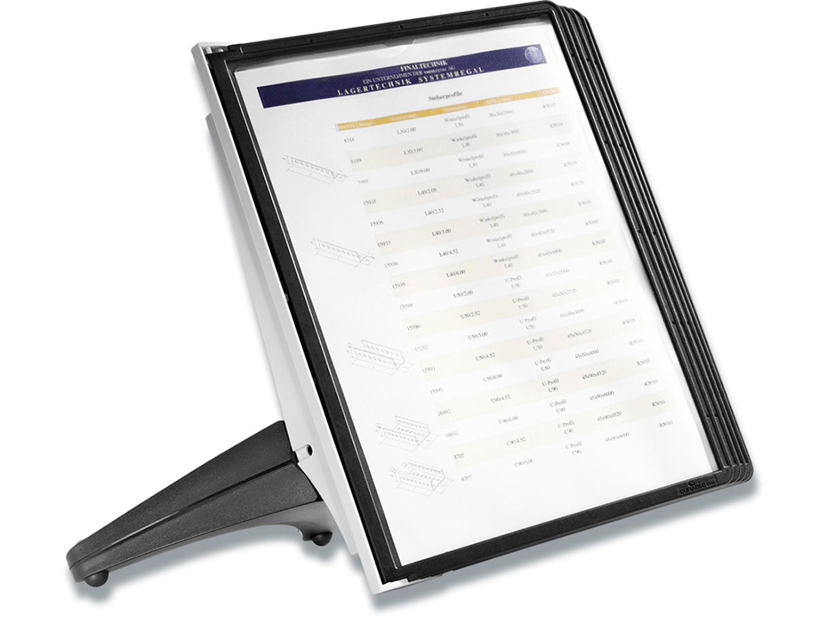 Pladsbesparende displaysystem med 5 stk. A4 lommer af refleksfri polypropylen plast samt etiketindstik, velegnet til den lille kontor eller hjemmekontoret. Det er nemt at skifte indhold i de miljøvenlige lommer. Den robuste fod giver en god stabilitet. 5 års garanti. Leveres med 5 stk. sorte lommer A5 i refleksfri polypropylen plast og etiketholder. 5 års garanti hvis produktet har en defekt som skyldes en fabrikationsfejl.