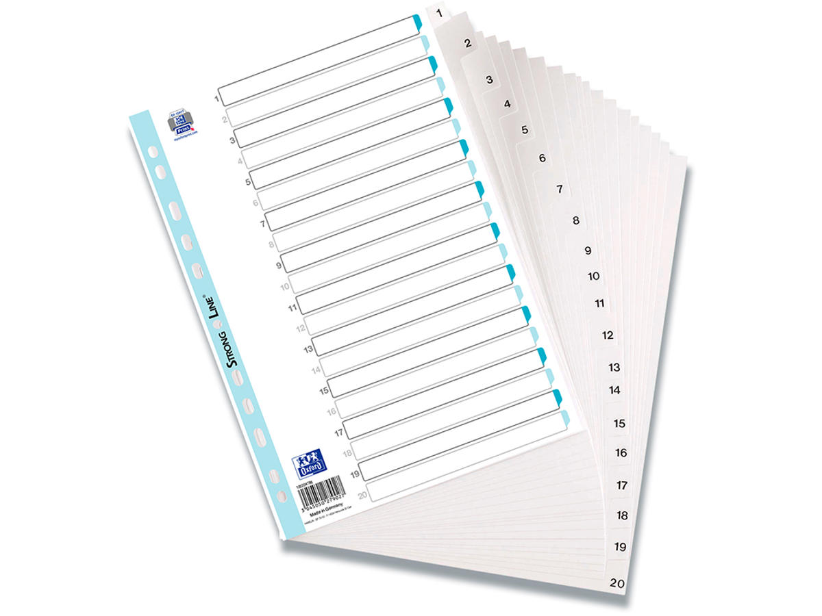 Fremstillet i slidstærk PP-folie. Forsynet med trykt kartonforblad med Strong-Line® hulforstærkning. Skabeloner til udskrift på en printer, kan hentes på www.oxfordprint.com