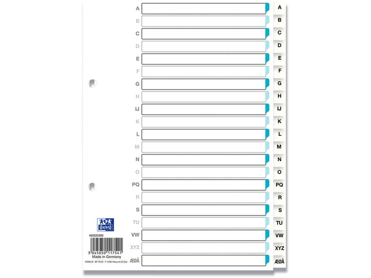 Register fremstillet i slidstærk PP-folie. Alfabet fordelt på 21 skilleblade. Forsynet med trykt kartonforblad med Strong-Line® hulforstærkning. Personliggør forbladet på www.oxfordprint.com