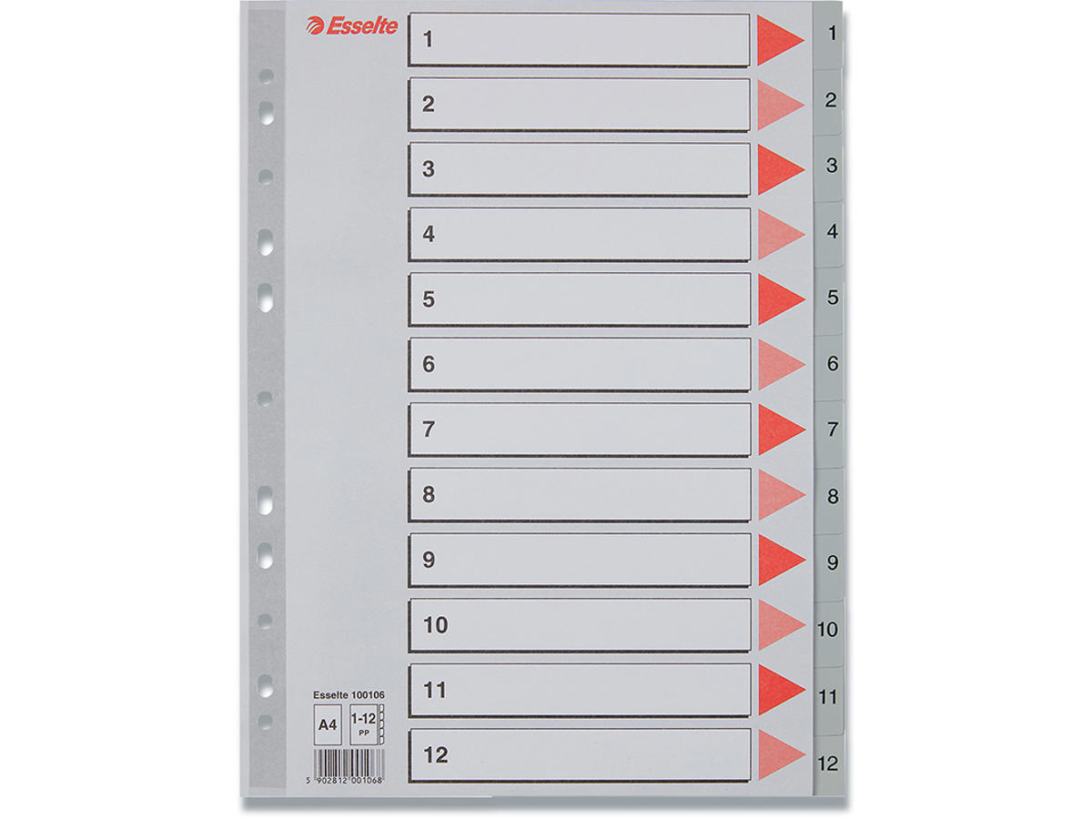 • Plastforstærket hullet stribe på forblad• 12 faner printet 1-12• 11 universalhuller• A4 format• 0,12 mm PP