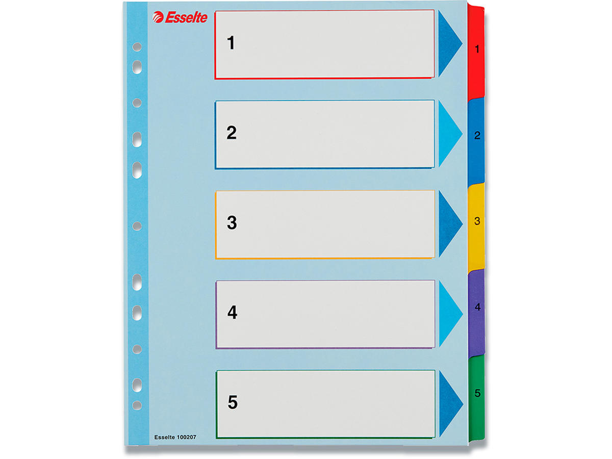 • 5 farvede faner med inddeling 1-5 for nem sortering af indhold. Tal printet på begge sider.