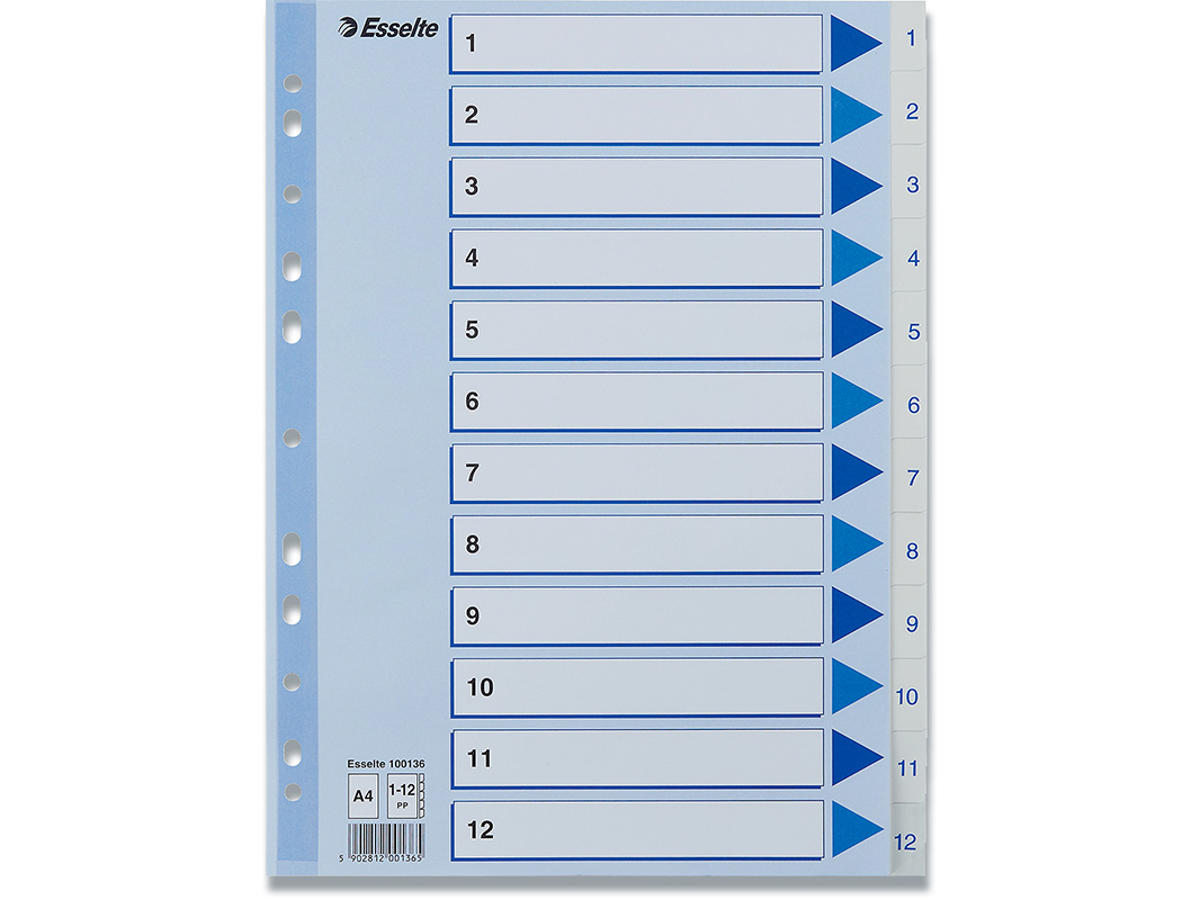 • Plastforstærket hullet stribe på forblad• 12 faner printet 1-12• 11 universalhuller• A4 format• 0,12 mm PP