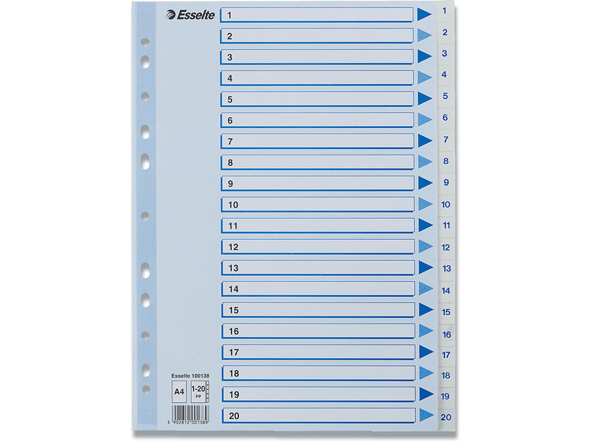 • Plastforstærket hullet stribe på forblad• 20 faner printet 1-20• 11 universalhuller• A4 format• 0,12 mm PP