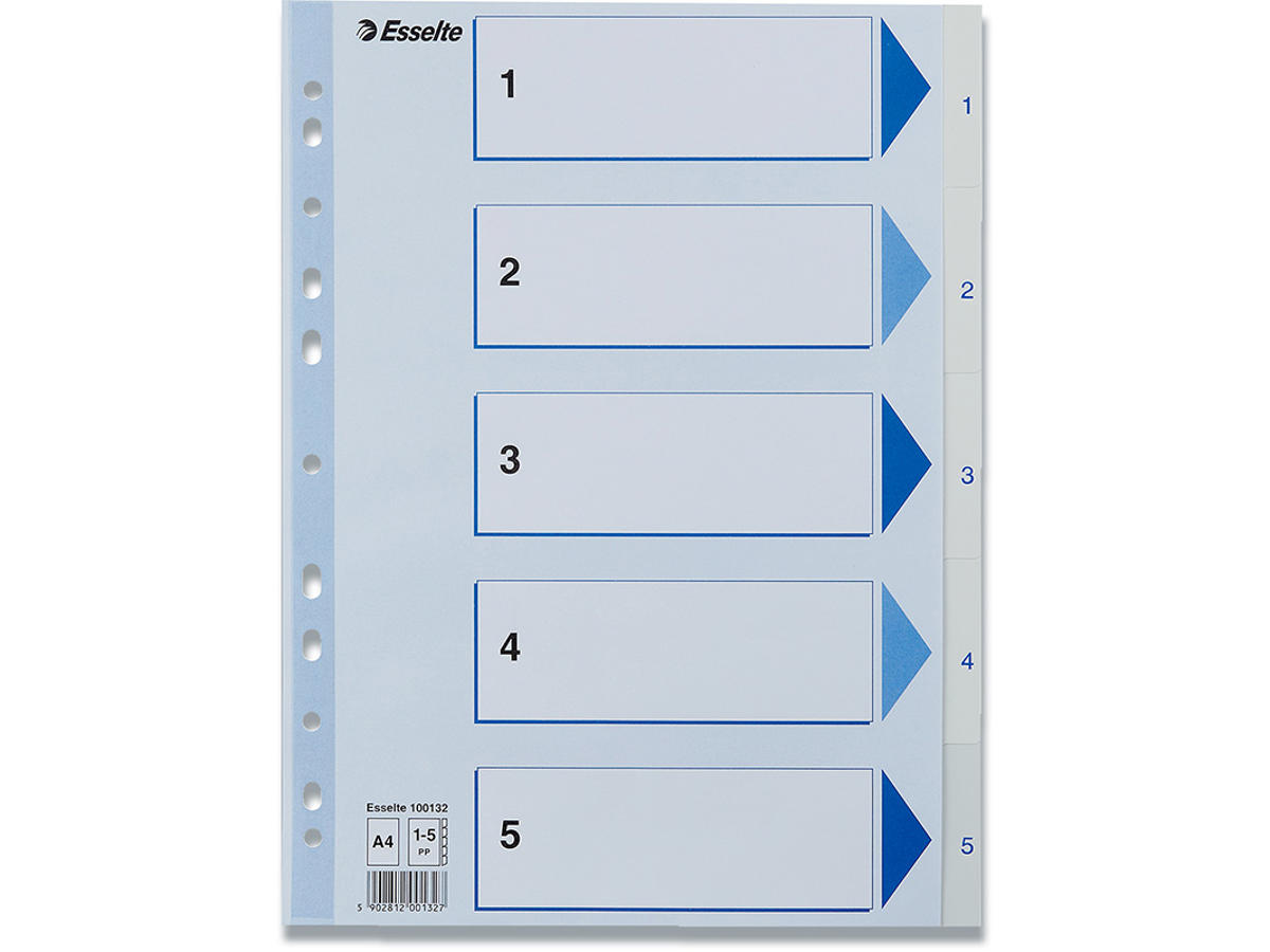• Plastforstærket hullet stribe på forblad• 5 faner printet 1-5• 11 universalhuller• A4 format• 0,12 mm PP