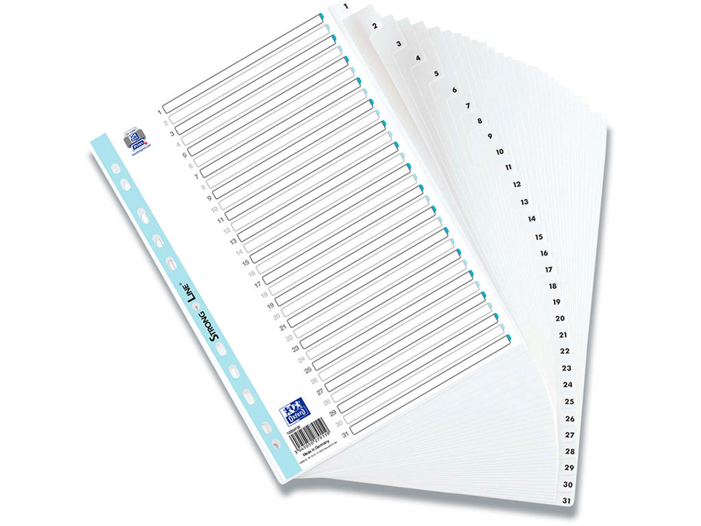 Fremstillet i slidstærk PP-folie. Forsynet med trykt kartonforblad med Strong-Line® hulforstærkning. Skabeloner, så forbladene kan tiltrykkes i en printer, kan hentes på www.oxfordprint.com