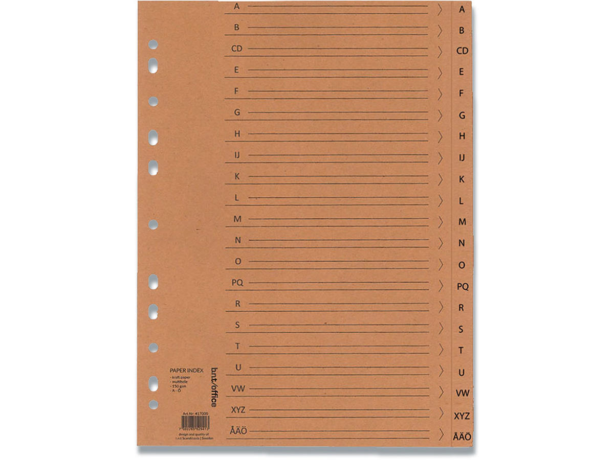 A4 register med indeksside og 21 faner (A-Ø). Multihuller til 2,3,4 og svenske huller. Fremstillet af kraftigt 150 grams kraftpapir, som er 100% genbrugt naturpapir.