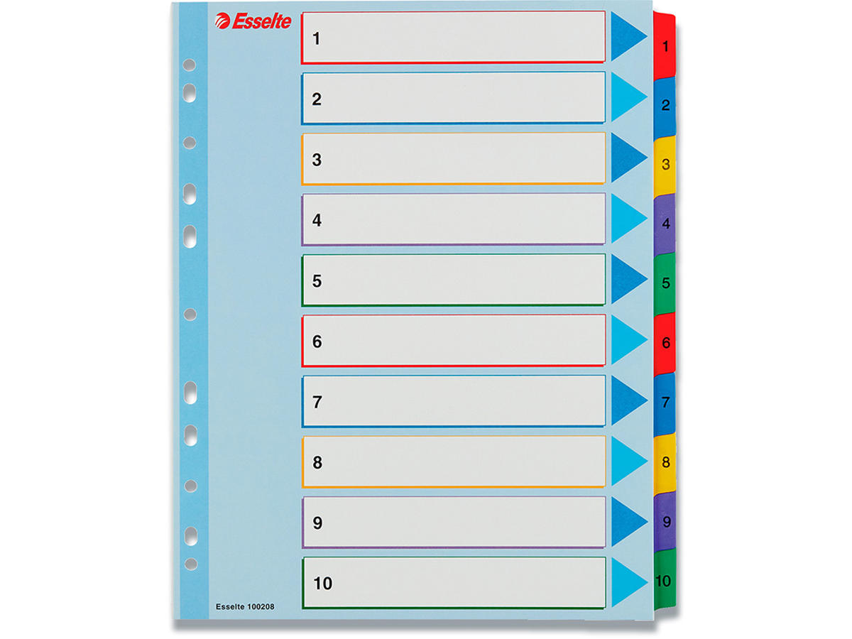 • 10 farvede faner med inddeling 1-10 for nem sortering af indhold. Tal printet på begge sider.