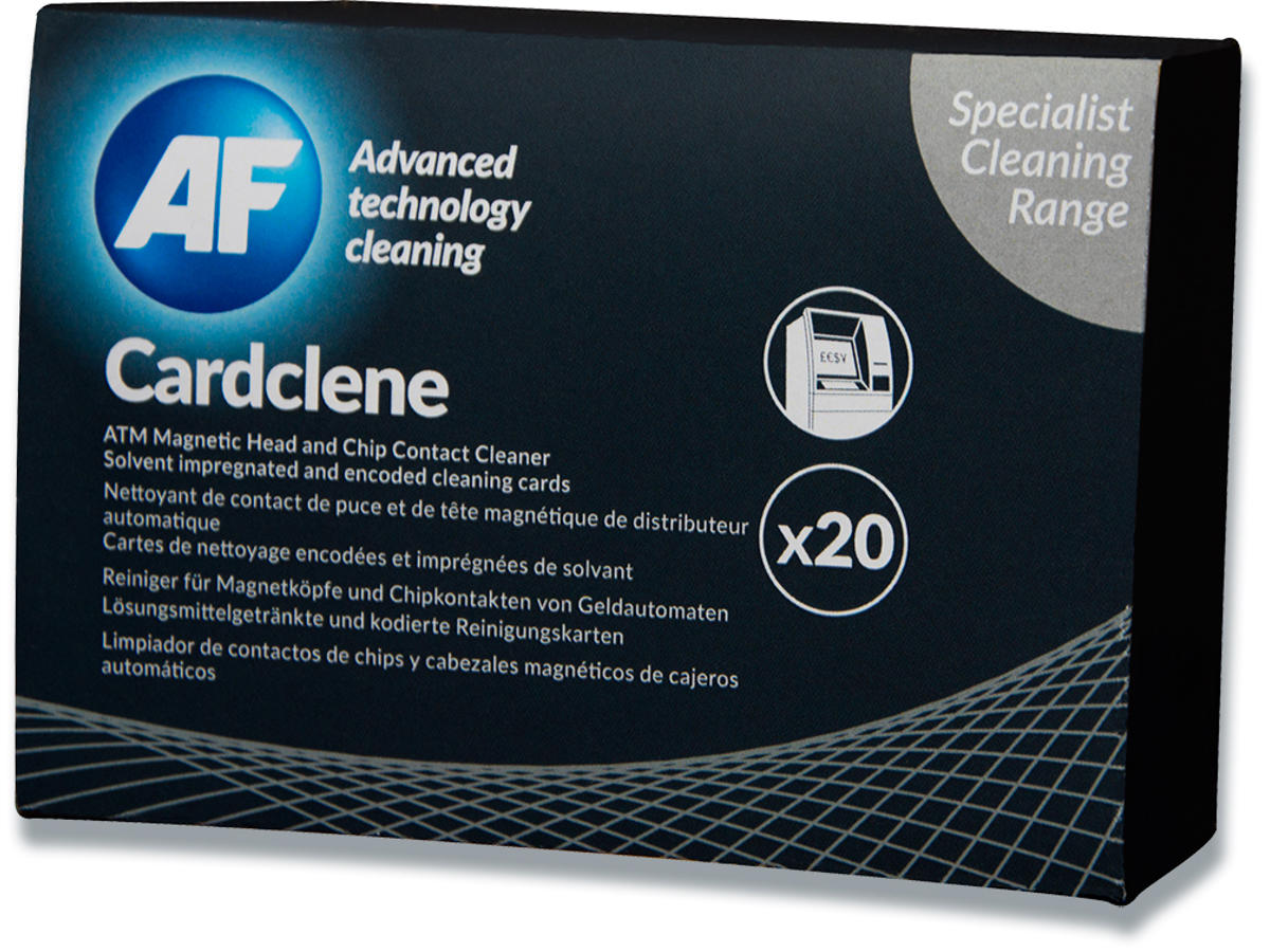 AF Cardclene chip. Imprægneret kode rensekort pakket i individuelle breve. Til rengøring af udstyr med magnetkort læsning. Et rengøringsystem til magnet hoveder, chip læsere og kortudstyr af hybride læsere i f.eks. hæveautomater. Rengøringskortet er med en kode, som er vigtigt få kortet ind og ud. Indeholder: 20 stk