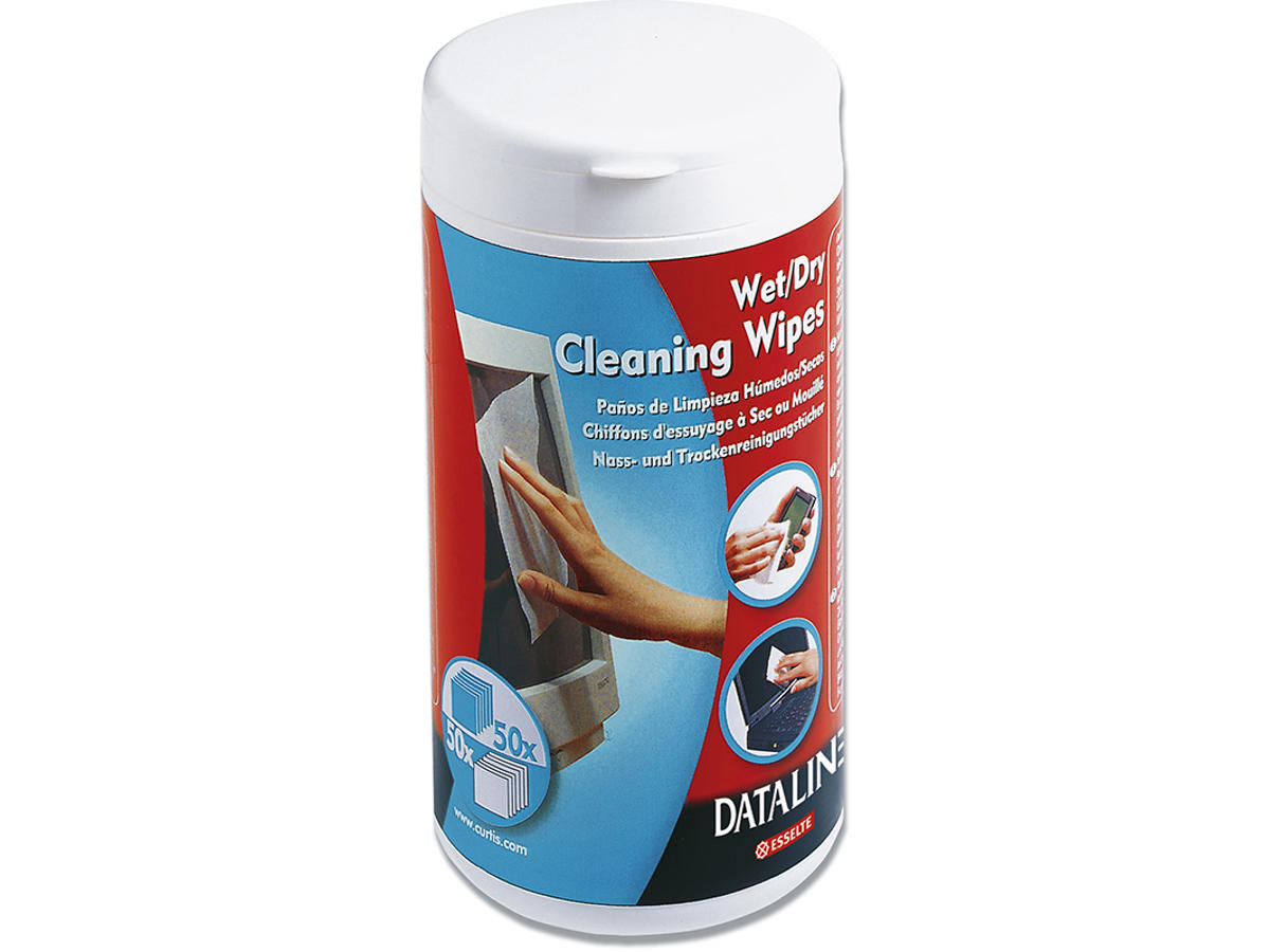 Stærke rengøringsservietter til rengøring af metal -og glasoverflader, printere, tastaturer, telefoner og kontorudstyr. Indeholder 50 vådservietter og 50 tørservietter. Hold dit skrivebord rent derhjemme eller på kontoret med Esselte Datalines serie af renseprodukter.