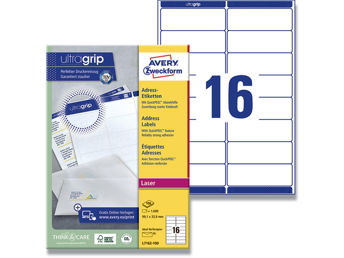 Du har kun to hænder, men et hav af opgaver på dit skrivebord. Og invitationen til næste uges konference skal med posten senest i eftermiddag kl. 16.00 - men hvordan skal du nå det hele på den halve tid? Store som små brevudsendelser bliver meget nemmere når du bruger Avery's hvide L7162-100 QuickPEEL™ etiketter med 16 etiketter/ark og 1.600 etiketter/pk. Du skal blot fjerne den perforerede del af bagarket for at blotte hjørnerne af etiketterne så du nemt kan få dem af og sætte dem på konvolutterne. Det giver en væsentlig tidsbesparelse, fordi du ikke skal fumle med at få fat i hjørnerne af etiketterne – faktisk helt op til 25% af den tid, du bruger, hvis du ikke benytter QuickPEEL™ funktionen. Du kan selvfølgelig også tage dem af på normalvis uden at fjerne den perforerede del. Denne pakke med 100 ark er perfekt til store brevforsendelser og etiketstørrelsen er især god til M65 konvolutter. De er kompatible med alle standard s/h- og farvelaserprintere. Den høje papirkvalitet giver dig flotte og knivskarpe prints. Og Avery's JamFREE™ garanti sikrer at du ikke behøver bekymre dig om etiketterne sidder fast i printeren og giver printerstop. Etiketterne klæber pålideligt og permanent. Avery's etiketter med QuickPEEL™ sparer dig ikke kun tid, men hjælper dig også med at passe på miljøet, da de kan genanvendes sammen med almindeligt papiraffald. Du kan nemt og helt gratis designe og printe dine Avery produkter med vores software Avery Design & Print, hvor du finder skabeloner, grafik og designs - Klik her