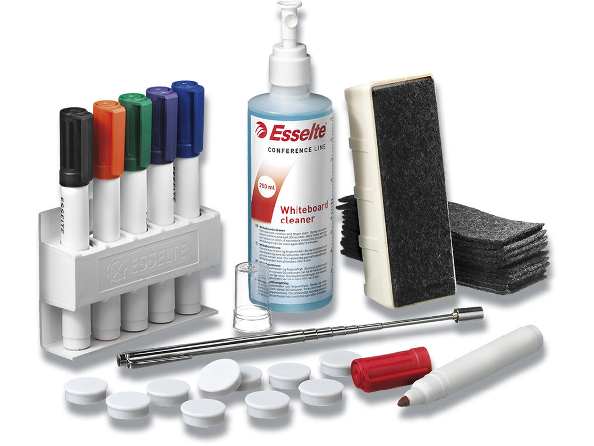 Komplet starter kit til whiteboardtavler, indeholder alt du skal bruge for at starte op med din whiteboardtavle. Penne, penneholder, tavlevisker, rensespray, magneter, pointer. Rensespray kan også bruges til glastavler.