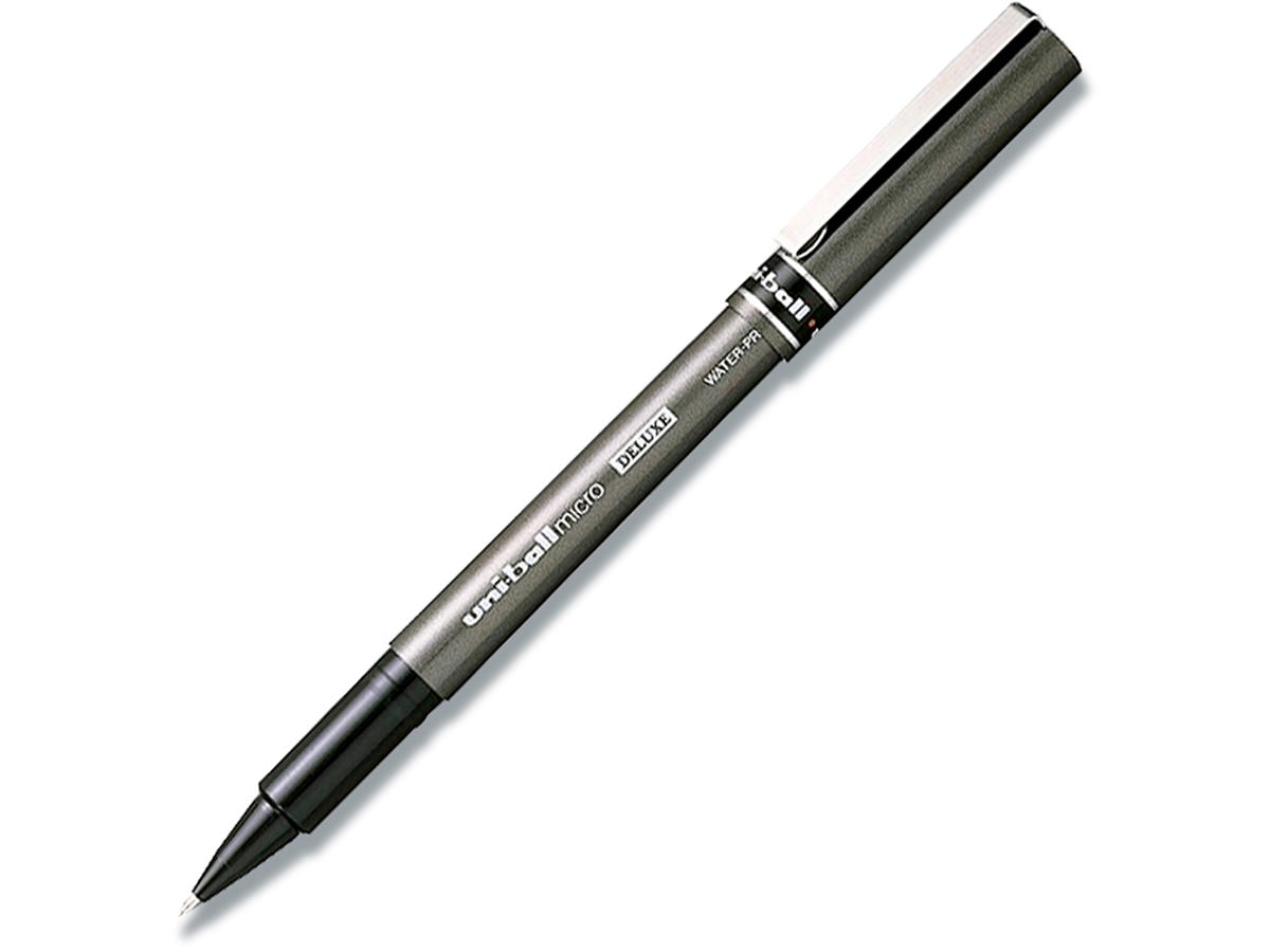 Uni-ball Micro Deluxe UB155 rollerpen med vandbaseret pigmentblæk. Vandfast og lysægte og dokumentægte. Godkendt til protokolføring og kirkebøger. Det lysægte blæk betyder, at skriften ikke falmer selvom den udsættes for lys. Hætten har metal clip og toppen af pennen indikerer skrivefarven. Kuglen af tungstenkarbid sikrer at pennen ikke klatter.