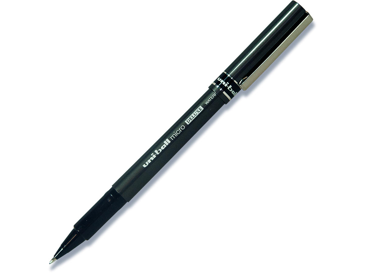 Uni-ball Micro Deluxe UB155 rollerpen med vandbaseret pigmentblæk. Vandfast og lysægte og dokumentægte. Godkendt til protokolføring og kirkebøger. Det lysægte blæk betyder, at skriften ikke falmer selvom den udsættes for lys. Hætten har metal clip og toppen af pennen indikerer skrivefarven. Kuglen af tungstenkarbid sikrer at pennen ikke klatter.
