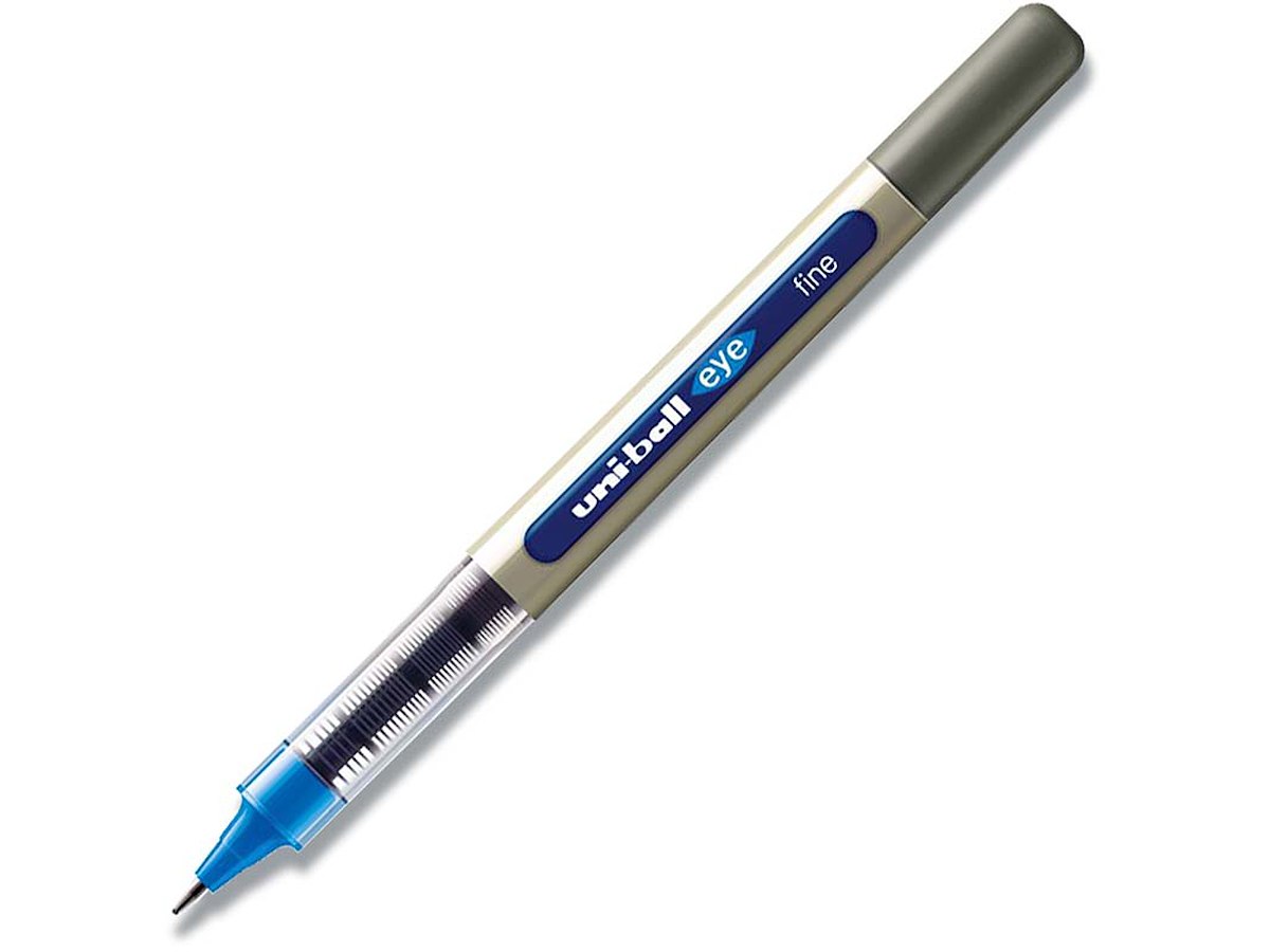 Med mulighed for at vælge utrolig mange forskellige farver, er denne pen blevet en af de mest solgte rollerpenne i hele verden. Denne Uni-ball Eye UB157E fine pen har et skaft af gråt PP-plast med synlig felt som viser den blå blækbeholdning. Hætten på denne pen har metal clip og i toppen af hætten indikerer ligeledes blækfarven. Skrivekuglen er en 0,7 mm tungstenkarbid og har en skrivebredde på 0,3 mm. Kuglen af tungstenkarbid sikrer at pennen ikke klatter. Rollerpennen skriver med vandfast og lysægte pigment blæk. Det lysægte blæk betyder, at skriften ikke falmer selvom den udsættes for lys.