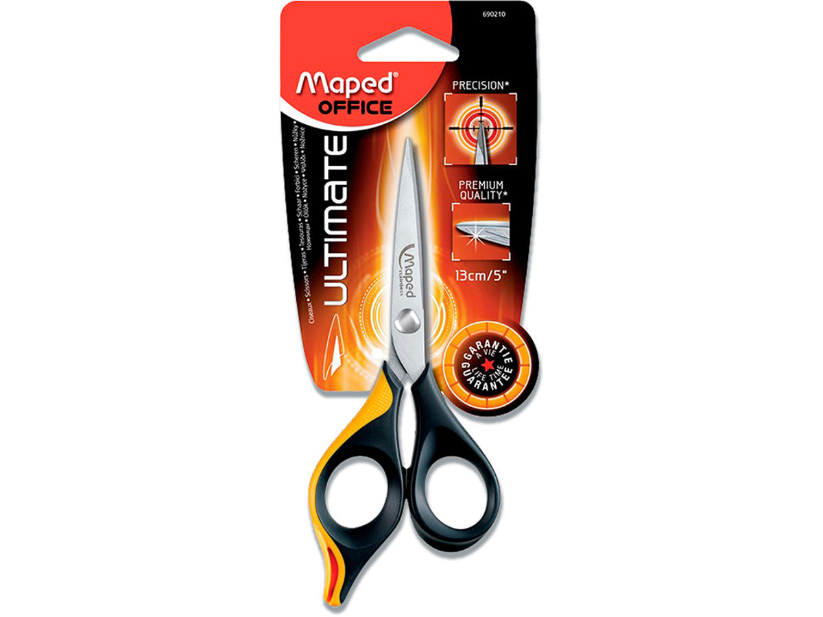 Maped Ultimate sakse har en høj kvalitet, hvor bladene er perfekt polerede og præget med et enkelt mønster. Saksen har en minimal modstandskraft, som gør saksen brugervenlig og ideel til præcise klippeopgaver. Saksene har en enestående ergonomi med perfekt fingerstøtte og er fremstillet i et blødt materiale, som gør saksene lækre at holde på og behagelige at bruge - også ved et intensivt brug.