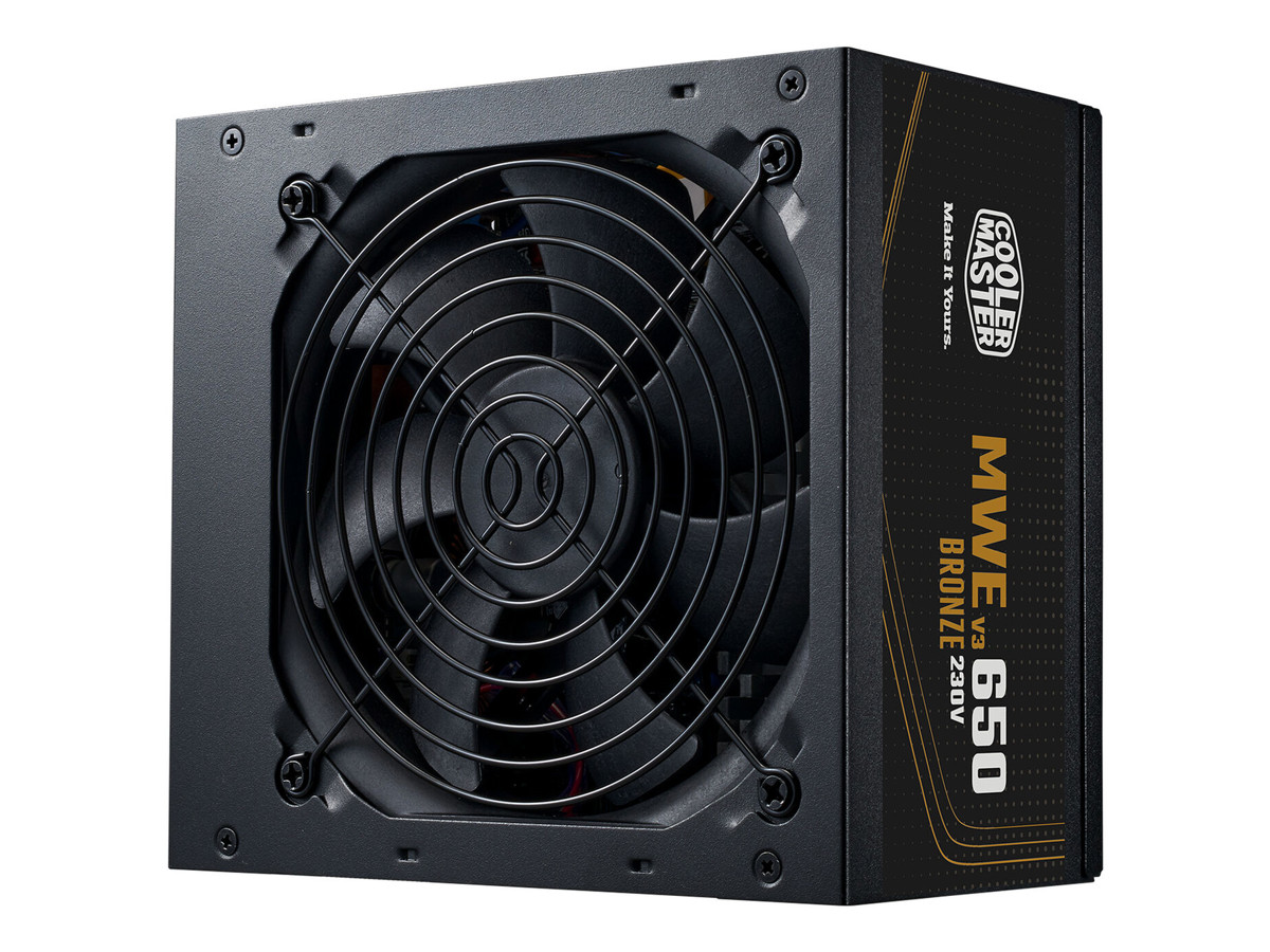 Cooler Master MWE Bronze 650 V3 230V. Total effekt: 650 W, Vekselstrømsindgangsspænding: 200 - 240 V, Vekselstrømsindgangsfrekvens: 50/60 Hz. Motherboard, strømstik: 24-pin ATX, Længde på strømkabel på bundkort: 50 cm, Strømkabellængde SATA: 400,550,700 mm. Formål: PC/server, Strømforsyningenhed (PSU) formfaktor: ATX, 80 PLUS certificering: 80 PLUS Bronze. Produktfarve: Sort, Kølingstype: Aktiv, Ventilator diameter: 12 cm. Compliance-certifikater: BIS, CE, China Compulsory Certification (CCC), EAC, Federal Communications Commission (FCC), RCM,..., Certificering: ErP 2014 Lot 3