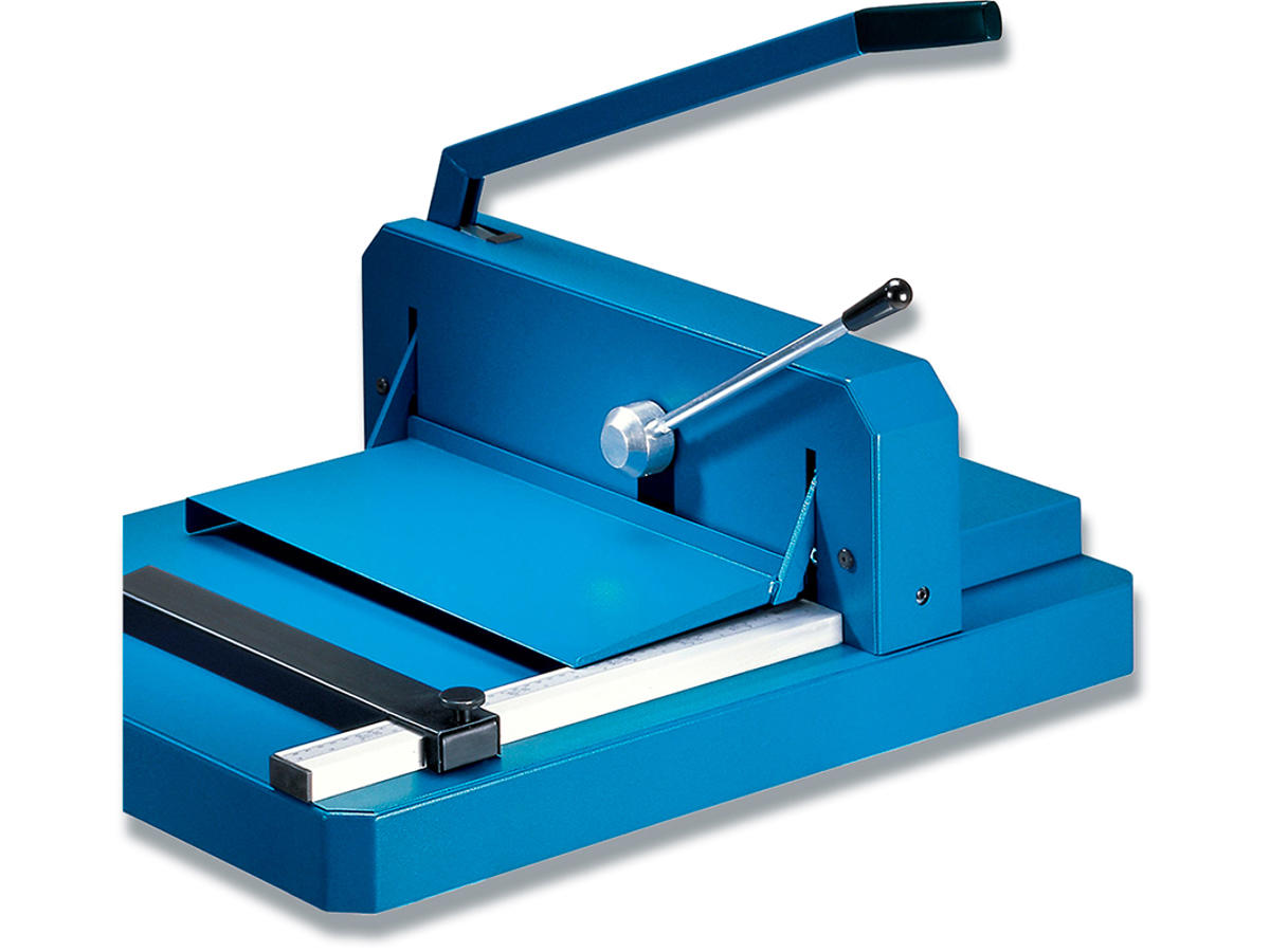 Stableskæremaskine til hurtig og præcist skæring af hele papirstakke. - med højeste ”sikkerhed”. Skærelængde: 430mm • Sleben overkniv. • Sikkerhedsskærm på begge sider af kniven, som kan løftes separat. • Hurtig pressefunktion. • Ryganlæg med mål i cm og inch. • Indstilleligt vinkelanlæg. • Arbejdsbord 430 x 430 mm. • Aflægsbord 430 x 215 mm • Tilbehør: gulvstativ DAH100712