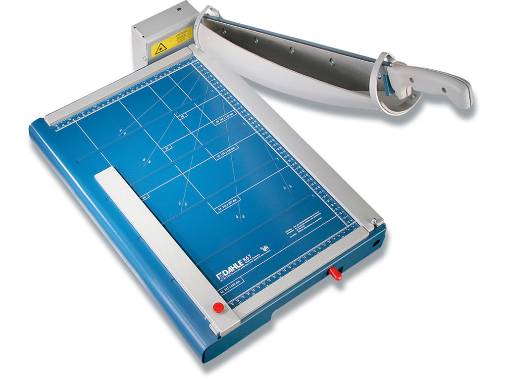 Anlægsbord: 513x365 mm - 20måleenheder med angivelse af cm og mm. Skærehøjde 3,5mm - svarende til ca. 35 ark. Monteret med under- og overkniv. Automatisk pressebalk, anlægsvinkel samt sikkerhedsautomatik. OBS! Sidebord, lasermodul og front- og smalskæreanlæg er ekstratilbehør. Hvis du ønsker denne maskine med alt ekstratilbehør, kan du med fordel bestille Dahle model 868 -
