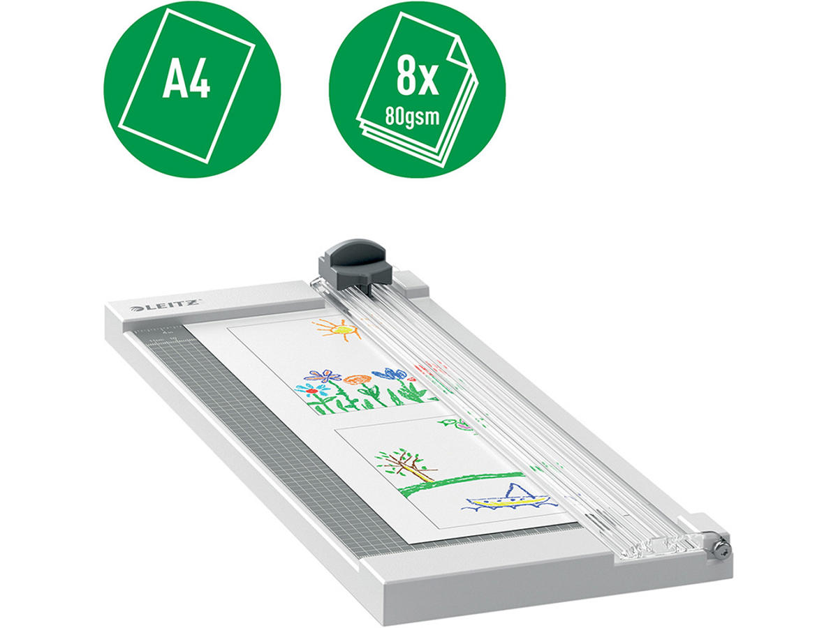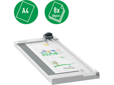 Leitz Precision Home A4 rulleskærer er perfekt til hjemmebrug, håndværks- eller hobbybrug til at lave kort, gaver, invitationer, fotokollager og mere. Denne lette og kompakte rulleskærer skærer ubesværet op til 8 ark A4-papir (80 g/m2) med hastighed og præcision og kan let opbevares, når den ikke er i brug. Det klare vindue og den gennemsigtige skæreskinne giver dig mulighed for at se knivbeskæringslinjen for fuldstændig nøjagtighed hver gang, mens rulleskærerhovedet med let greb sikrer behagelig brug. Det er hurtigt og nemt at indsætte papiret med flip op papirklemme og de klare måleretninger giver mulighed for nøjagtig justering. Med skarpe, hærdede stålblade, en robust arbejdsflade og 2 års garanti har du ro i sindet med denne rulleskærer i god kvalitet.