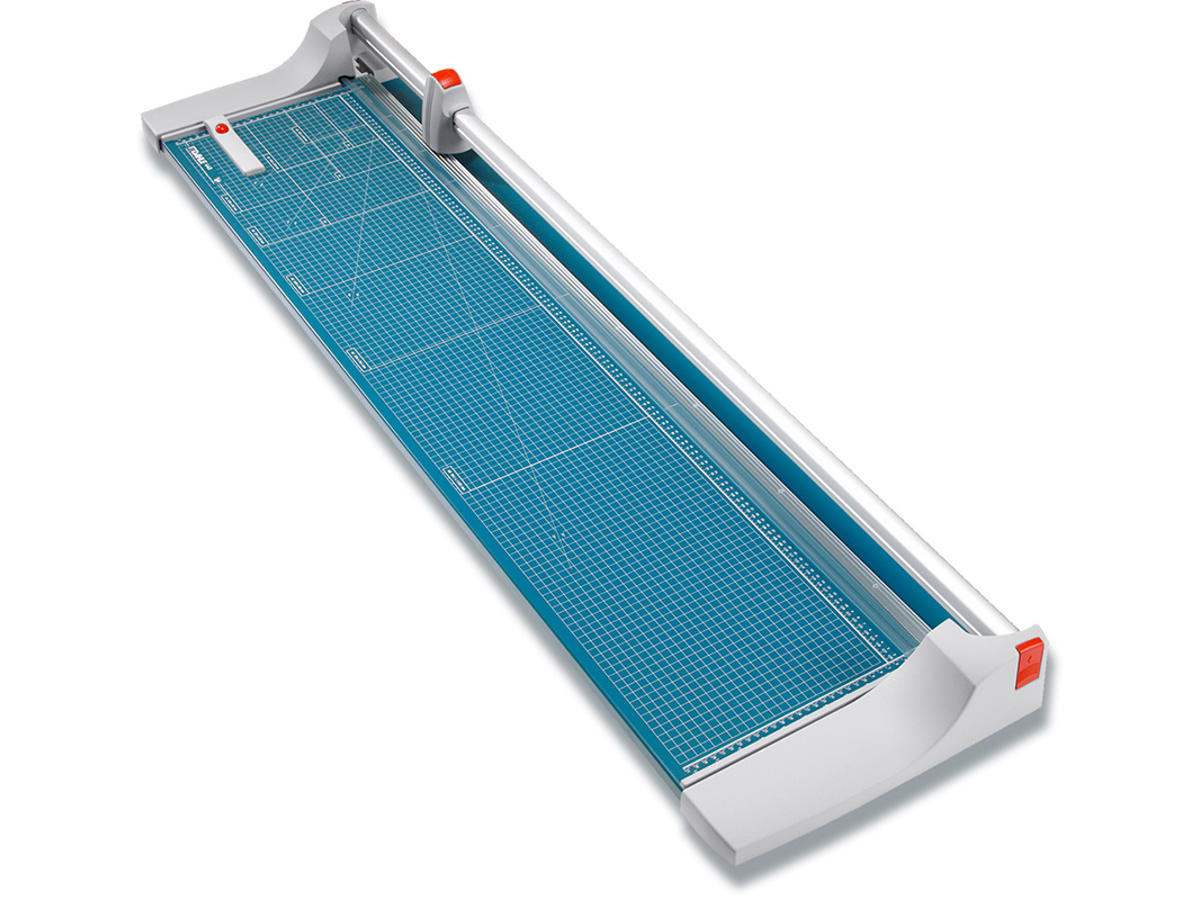 Rulleskærer Dahle 448 med særlig høj skæreydelse op til 20 ark 80 g / kvm papir. Absolut sikkerhed takket være det lukkede skærehoved. Metalbord. Skærelængde: 1300 mm. Klippehøjde: 2,0 mm. Jordet cirkulær kniv i et lukket plasthoved og jorden nedre kniv - begge knive lavet af hærdet specialstål. Automatisk presning ved grænsefladen. To vinkelsystemer. Justerbart rygstop. Retningslinjer i DIN, cm, tomme og gradering på bordet. Bordstørrelse: 1500 x 384 mm, vægt: 10,0 kg. GS-godkendt. Tilgængeligt tilbehør: Dahle 798 bundramme. 5 års garanti (ekskl. Sliddele).
