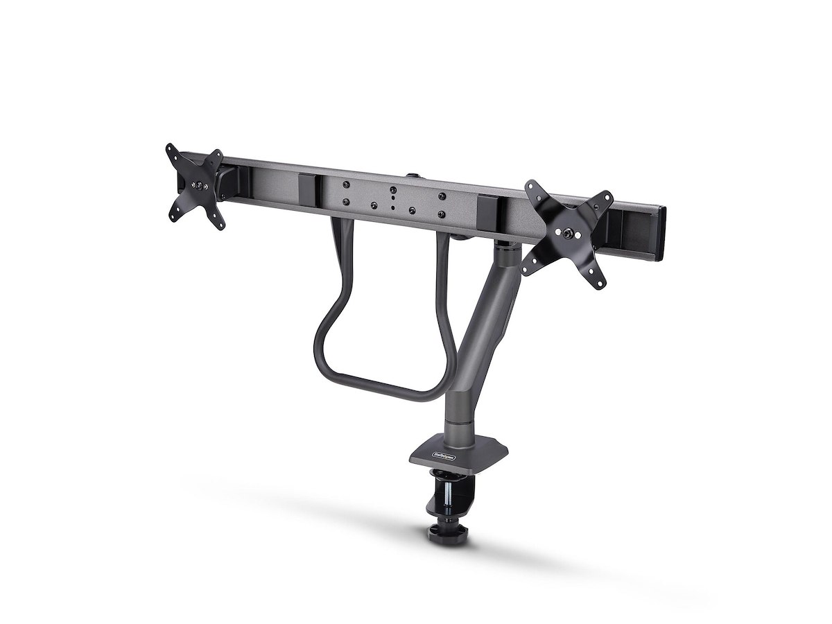 This crossbar monitor desk mount is designed to support up to two 27-inch displays, creating an ergonomic multi-monitor setup that provides an extensive viewing area for productivity. The built-in handle enables moving all monitors simultaneously, while the spring-assisted arm enables multiple adjustments to suit different ergonomic needs.