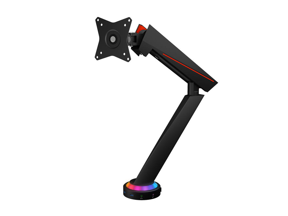 Create atmosphere in your room with this gaming monitor stand. With its trendy RGB light effect, it fits perfectly into any environment. It also adds two more USB 3.0 ports and a microphone and headphone jack to your end device. Thanks to the built-in spring tension gauge, the monitor can be perfectly adjusted to its weight.