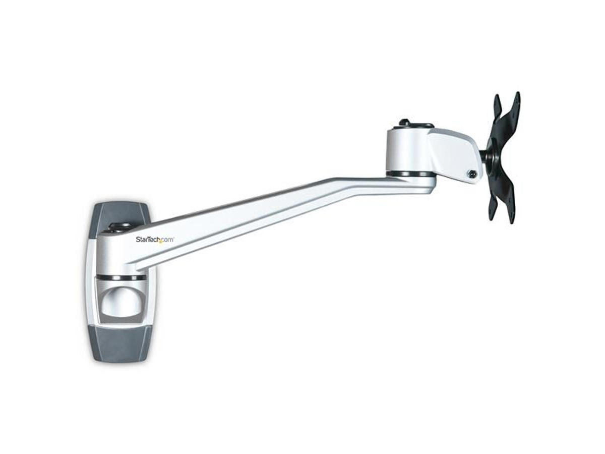 Free up space with this wall-mount monitor arm and enjoy optimum viewing with the swiveling extension arm. The premium design ensures smooth, effortless motion and makes it easy to re-position your display, to work in comfort or collaborate with others. The attractive silver finish complements your decor.