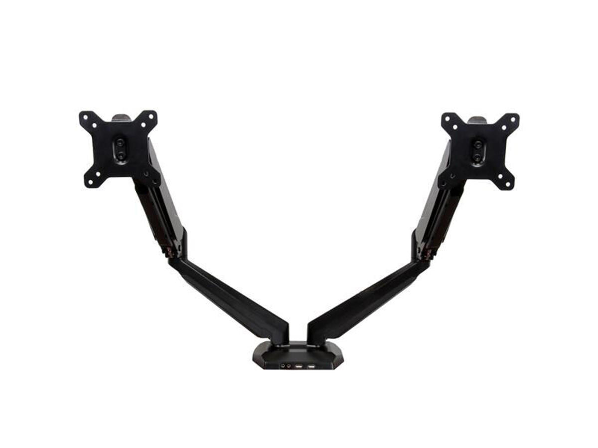 Enhance productivity and free up valuable space with the ARMSLIMDUO Dual-Monitor Arm. Two independent arms make it easy to adjust your dual-monitor setup, plus two USB pass-through ports and headset plugs provide easy accessibility to ports. Create a more ergonomic dual-monitor setup When you mount your displays on a dual-monitor arm above your desk or table surface, you can adjust your display height, position and viewing angles easily to create a more comfortable and ergonomic work environment. You also get the added benefit of reclaiming valuable workspace by clearing monitor stands off your desk, plus the cable management system keeps cables neatly tucked away. The dual-arm monitor mount holds two 12" to 32" monitors, side-by-side, with ease. Each arm supports up to 8.0 kg (17.6 lb.) of weight. Built-in USB pass-through ports and audio ports The ARMSLIMDUO gives you easy access to two USB pass-through ports and two audio ports located at the front of the base. The ports let you conveniently extend the ports on your PC or laptop, using the integrated cables. This lets you plug in your microphone, headset or USB devices, without having to reach around to access the ports on your computer. It also gives you a cleaner cable setup, which adds to a more productive, less cluttered work space. Full-motion arms with articulation and spring-assisted height adjustment The desk-mount monitor arms offer a full range of motion on several axes, letting you tilt, pan and rotate your monitors to adjust your viewing angle any time to suit your changing needs. To view longer pages or blocks of code without scrolling, the arms also support landscape-to-portrait display rotation for each monitor. The spring-assisted height adjustment makes raising or lowering your monitors effortless. You can also adjust the tension to your own preference. Durable construction and easy setup With its durable aluminum construction, the ARMSLIMDUO securely holds two monitors using a standard VESA mount. The C-clamp makes it easy to install the dual-monitor arm mount to your desk or table. The fast insert function makes it easy to attach your monitor. The ARMSLIMDUO is backed by a 2-year StarTech.com warranty and free lifetime technical support.