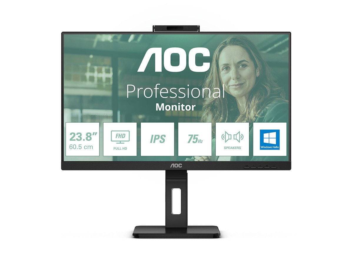 The AOC 24P3CW is a 23.8” flat-screen IPS monitor with a three-sided bezel design that has everything you need to get the most out of your workday. Enjoy enhanced Full HD (1920 x 1080) resolution for crisp, vivid colors and realistic picture quality, in addition to 300-nit brightness and generous 178/178° wide viewing angles. To ensure smooth remote collaboration, this monitor features two built-in 5W + 5W speakers for high-quality sound and a 5MP integrated webcam supporting Windows Hello™. Monitor 24P3CW is ready to boost your productivity with USB-C supporting Power Delivery up to 65W, data transfer and DP-alt mode. Connectivity of this monitor is enhanced with USB Hub, RJ-45 & DP-out. To ensure the most efficient power consumption, an array of environmental certifications including EPA, TCO, and EPEAT complete this monitor. -
