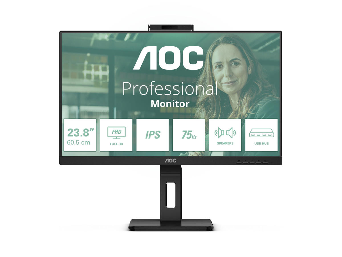 AOC 24P3QW. Skærm diagonal: 60,5 cm (23.8"), Skærmopløsning: 1920 x 1080 pixel, HD-type: Fuld HD, Responstid: 4 ms, Naturligt aspektforhold: 16:9, Synsvinkel, horisontal: 178°, Synsvinkel, vertikal: 178°. Indbyggede højttaler(e). Indbygget USB-hub, USB-hub-version: 3.2 Gen 1 (3.1 Gen 1). VESA montering, Højdejustering. Produktfarve: Sort