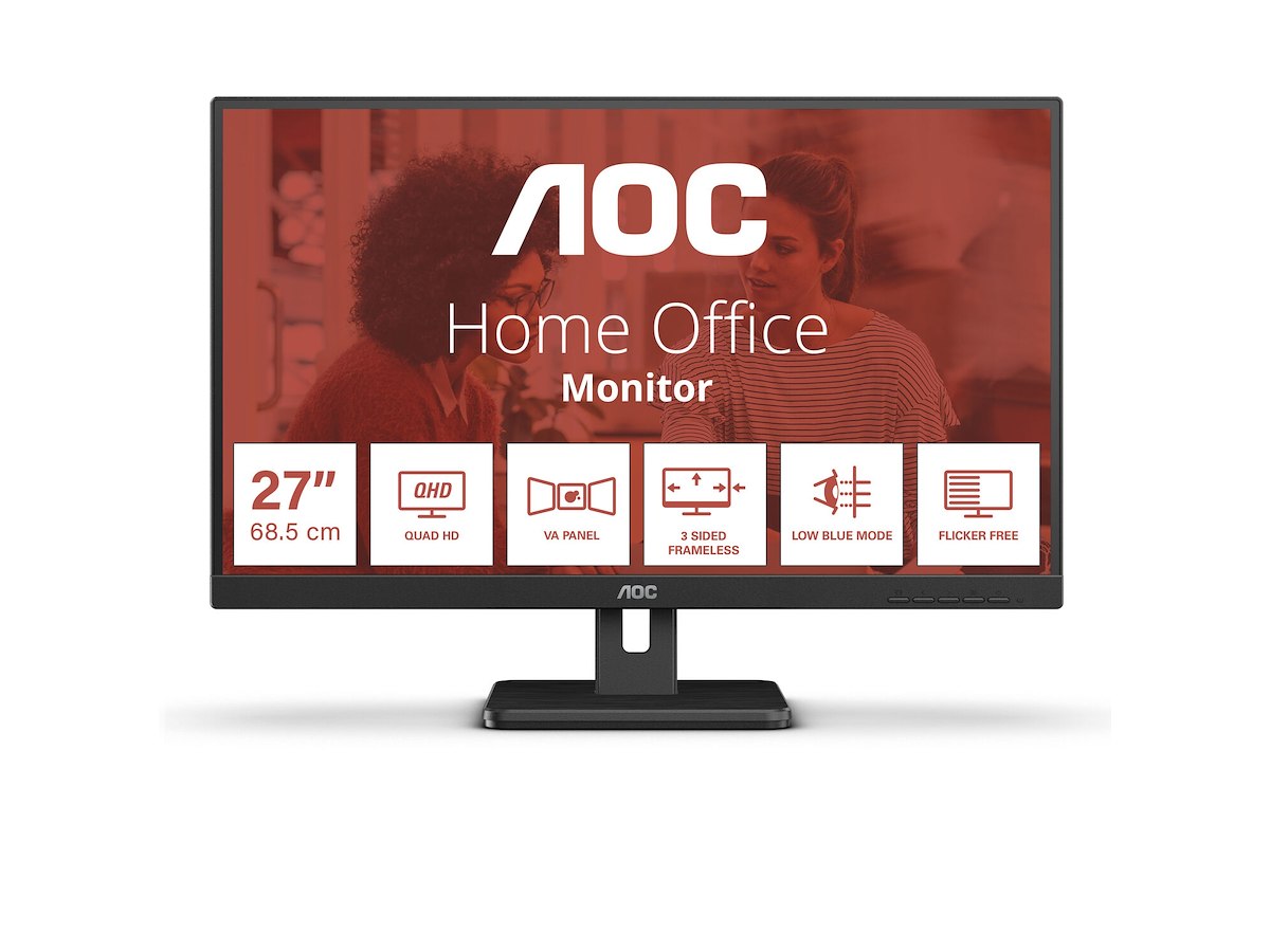 AOC E3 Q27E3UAM. Skærm diagonal: 68,6 cm (27"), Skærmopløsning: 2560 x 1440 pixel, HD-type: Quad HD, Responstid: 4 ms, Naturligt aspektforhold: 16:9, Synsvinkel, horisontal: 178°, Synsvinkel, vertikal: 178°. Indbyggede højttaler(e). Indbygget USB-hub, USB-hub-version: 3.2 Gen 1 (3.1 Gen 1). VESA montering. Produktfarve: Sort