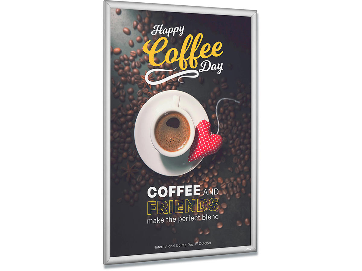 Klassiske klikramme, snapramme, klapramme er nyttige i fitnesscentre, kontorer, hoteller, messer og butikker til pænt at vise information, der skal udskiftes fra tid til anden. Udskift dokumentet ved at folde alle 4 sideprofiler op og fjerne den UV-bestandige og antireflekterende plastfront, der beskytter materialet. Klikrammen er fremstillet med en 25 mm bred anodiseret aluminiumprofil, hvilket gør aluminiumoverfladen mere holdbar. Bagsiden af klikrammen er fremstillet af holdbart polystyren. Monteringssæt medfølger, det indeholder skruer og ravpluks samt selvklæbende tape til valgfri vægmontering i høj- eller tværformat.