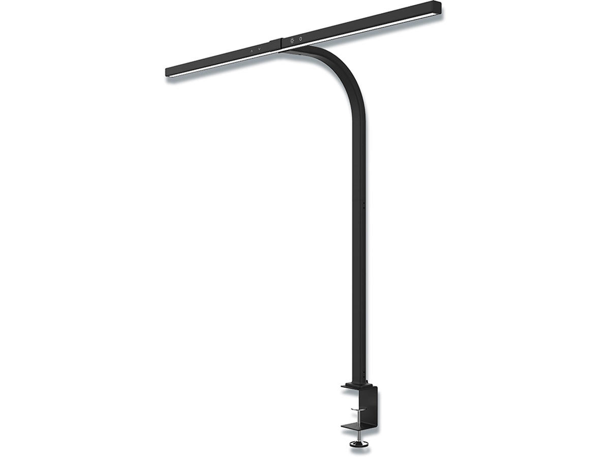 Denne skrivebordslampe har et innovativt, slankt og 80 cm langt design og er takket være dens klemme let at installere på bagsiden af skrivebordet. Når lampen placeres over din computerskærm og dit tastatur, bidrager den med et bredt lys og giver skræddersyet belysning takket være de to berøringsfølsomme kontakter, der er placeret på lampens hoved, hvor den ene varierer lysstyrken og den anden tilbyder 3 farvetemperaturer.