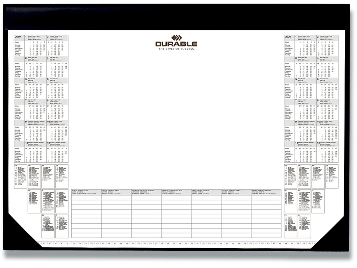 Skriveunderlag med kalendere er et nyttigt værktøj i det daglige arbejdsliv. Udover at være behageligt at skrive på, giver kalenderblokken mulighed for hurtigt at skrive notater og aftaler ned på papiroverfladen. Dette skriveunderlag er med 2 års kalender à 25 ark, der er limet i bunden som beskyttelse mod slitage og krølning. Den er med oversigt over helligdage i ni lande. Ideel til notering og skridsikker. Mål: 590 x 420 mm (B x H)