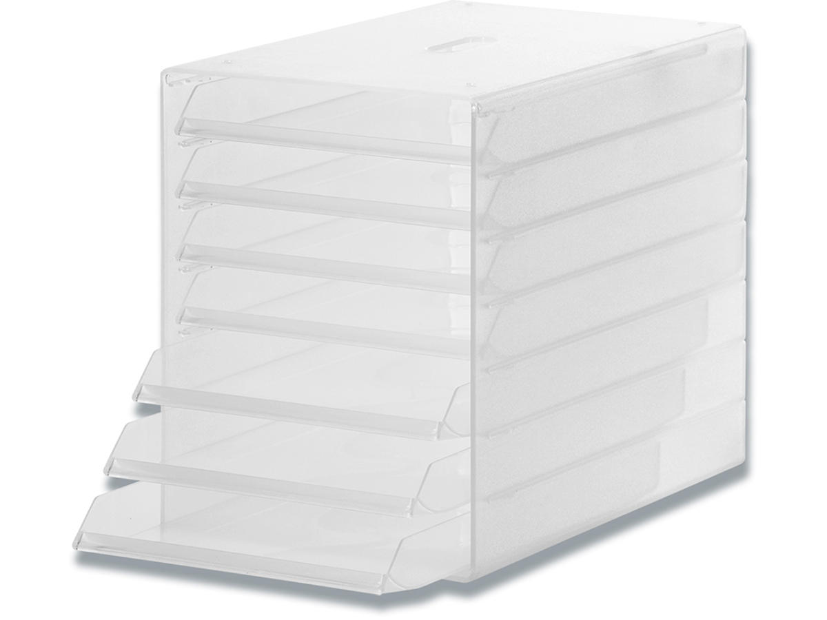 Skuffekabinet med syv åbne skuffer der gør det muligt at ilægge papirer uden at åbne skufferne. Opbevaringsboksen kan placeres på skrivebordet, monteres under bordet eller hænges på væggen. Passer til dokumenter op til C4 format. Med bærehåndtag på toppen. Mål: 250x322x365mm (BxHxD)