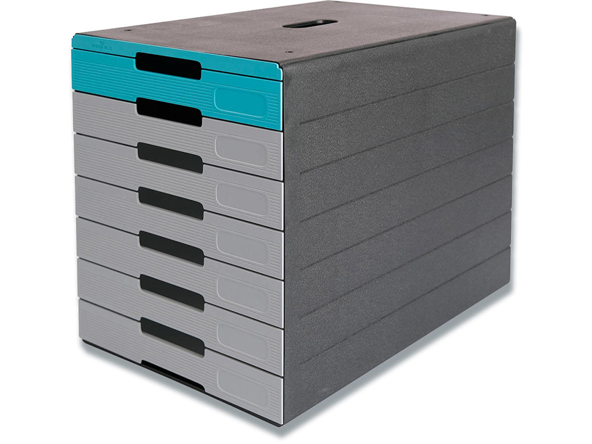 IDEALBOX PRO 7 er et praktisk og fleksibel skuffekabinet med udtrækkelige skuffer til opbevaring og sortering, men som stadig giver hurtig adgang til forskellige dokumenter. Kan placeres på skriveborde, reoler og hylder eller i kontorskabe på f.eks. kontoret, lageret og i produktionen. Kan rumme dokumenter op til C4-størrelse. I alt 7 skuffer, den øverste skuffe i samme farve som toppen af kassen, udtræksstop og en indvendig højde på 3,4 cm. Der medfølger et ark med 8 aftagelige selvklæbende etiketter (15x50 mm) til mærkning af skufferne.