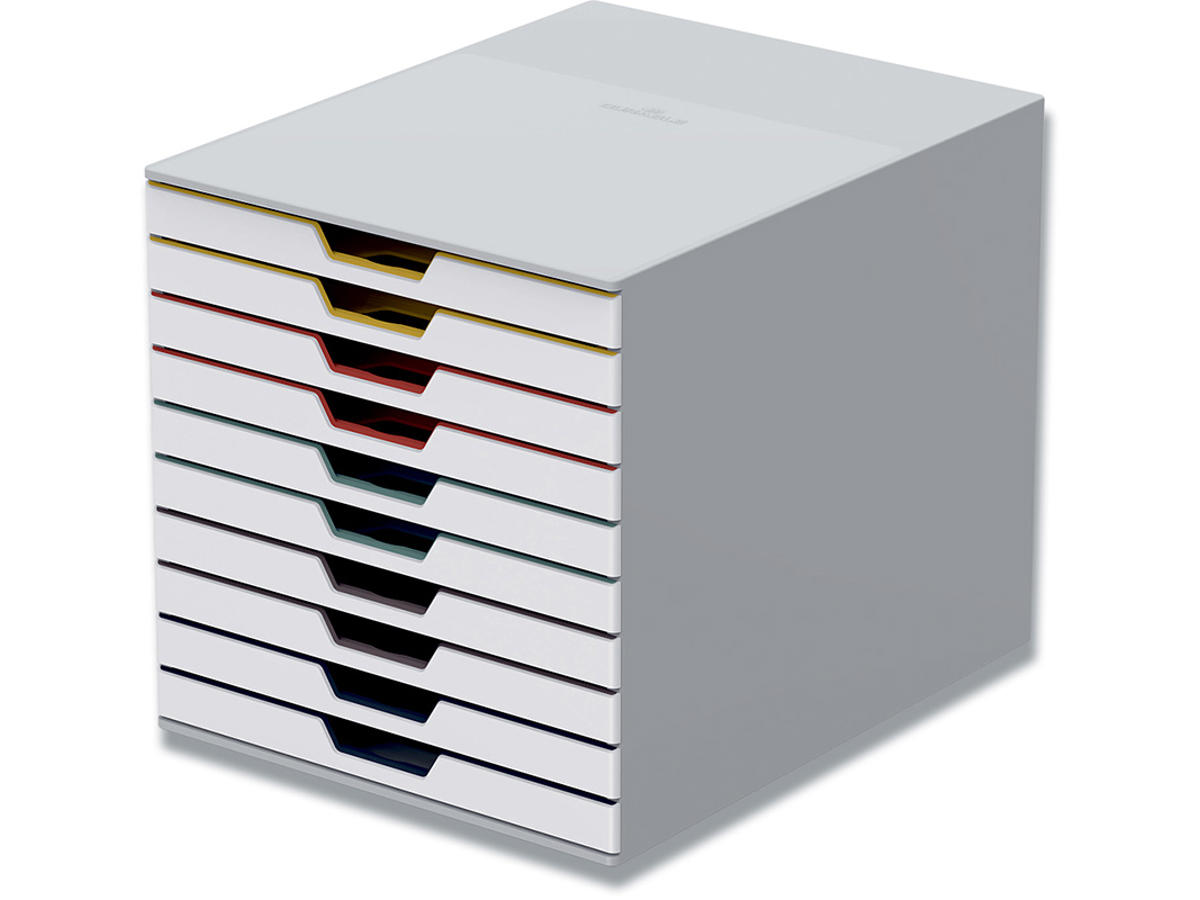 Skuffekabinet eller skuffeboks - uanset hvad du kalder den, er VARICOLOR® MIX 10 et klassisk skuffekabinet i et moderne design til opbevaring og organisering af papir og andre ting. Den kan stå på borde, bænke, reoler og hylder eller bruges i kontorskabe. Skuffekabinettet har letgående og lydløse skuffer i forskellige farver med udtræksstop. Kan rumme dokumenter op til C4-størrelse. Transparente etiketholdere med printbare og udskiftelige etiketter er inkluderet. Kan stables oven på hinanden. Skridsikre plastfødder sikrer, at kassen står fast og ikke ridser det underlag, den står på. I alt 10 skuffer med en indvendig højde på 2 cm.