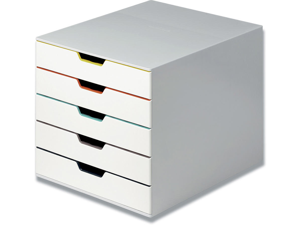 Skuffekabinet eller skuffeboks - uanset hvad du kalder den, er VARICOLOR® MIX 5 et klassisk skuffekabinet i et moderne design til opbevaring og organisering af papir og andre ting. Den kan stå på borde, bænke, reoler og hylder eller bruges i kontorskabe. Skuffekabinettet har letgående og lydløse skuffer i forskellige farver med udtræksstop. Kan rumme dokumenter op til C4-størrelse. Transparente etiketholdere med printbare og udskiftelige etiketter er inkluderet. Kan stables oven på hinanden. Skridsikre plastfødder sikrer, at kassen står fast og ikke ridser det underlag, den står på. I alt 5 skuffer med en indvendig højde på 5 cm.